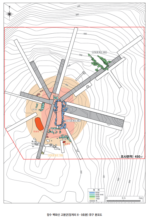 2. 장계리 8호분은 봉토 평면 형태가 동-서가 약간 긴 (타)원형이고, 매장주체부를 중심으로 남쪽에서 소형 석곽묘 4기와 옹관, 토광묘가 확인되어 8호분에 배장陪葬된 묘들로 추정된다. 8호분 축조방법은 매장주체부인 주석곽主石槨을 축조하고 1차적으로 석곽 위에 성토盛土를 하고 최종적으로 봉분을 조성한 것으로 보인다.