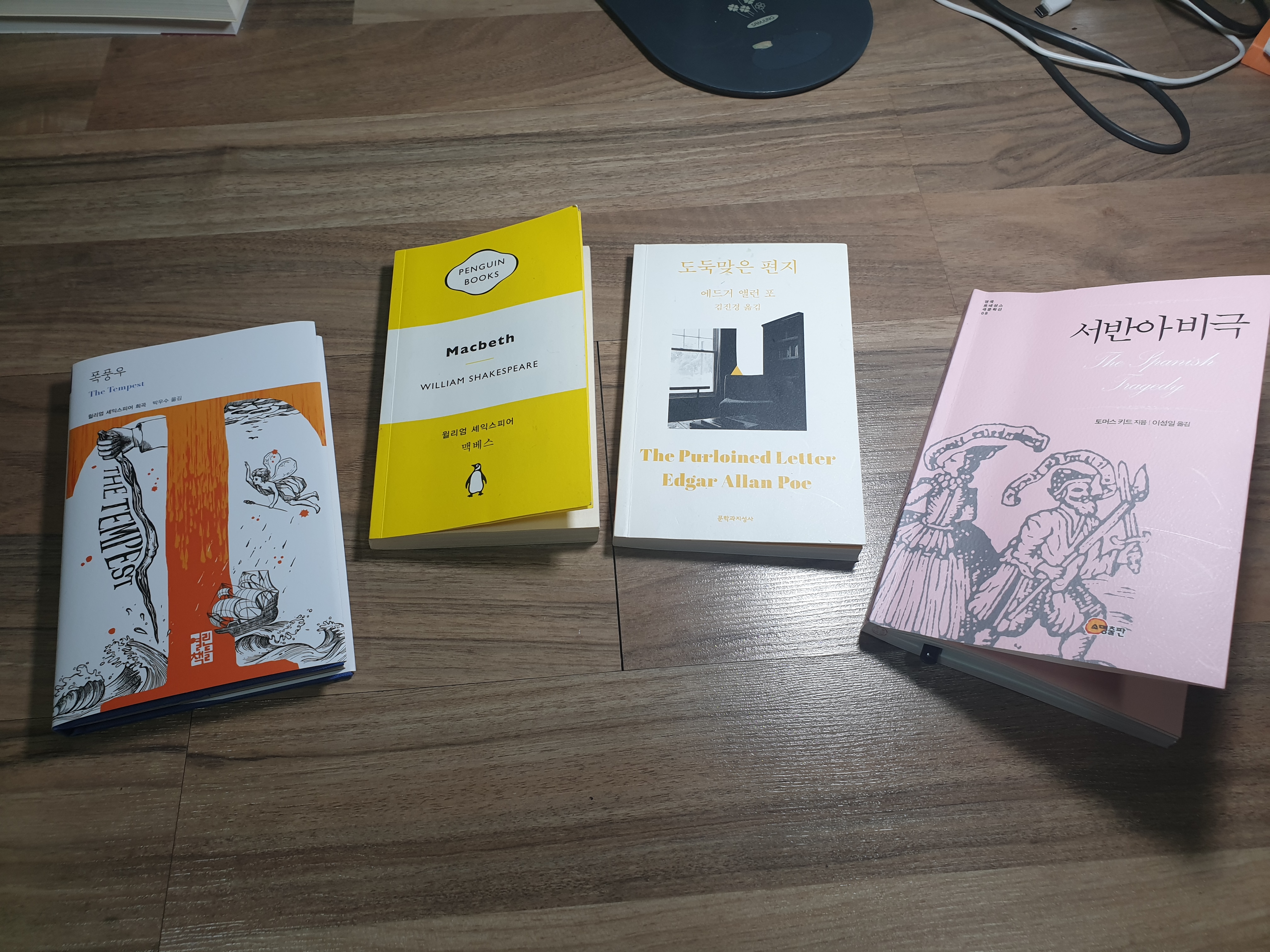 한때 영문학 언저리 맴돌았다고 긁어다 놨는데 셰익스피어가 《템피스트 the Tempest》와《맥베스 Macbeth》두 종, 나머지가 애드거 앨런 포 단편선《도둑맞은 편지 the Purloined Letter》, 그리고 셰익스피어보단 대략 열살 정도 위인 토머스 키드《서반아 비극 the Spanish tragedy》다. 이 중 키드는 앞서 잠깐 소개한 적 있다.