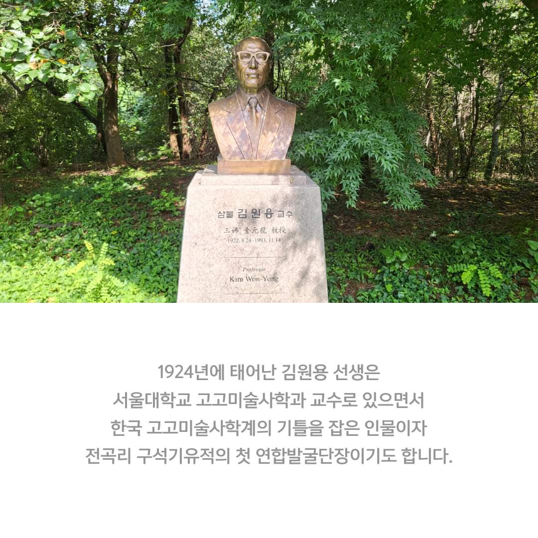 1924년에 태어난 김원용 선생은 서울대학교 고고미술사학과 교수로 있으면서 한국 고고미술사학계의 기틀을 잡은 인물이자 전곡리 구석기유적의 첫 연합발굴단장이기도 합니다.🙂