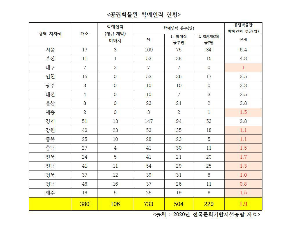 총람에서는 모든 학예인력으로 평균을 내어 2.7명이라는 숫자가 나왔지만, 실제로 박물관 학예업무를 담당하고 총괄하는 학예연구사를 기준으로 3번의 계약직을 제외하여 통계자료를 다시 추출해보니, 전체 공립박물관의 학예사 인력은 1개관 당 평균 1.9명으로 확인되며, 학예인력이 아예 배치되지 않은 공립박물관은 106개로 확인된다.