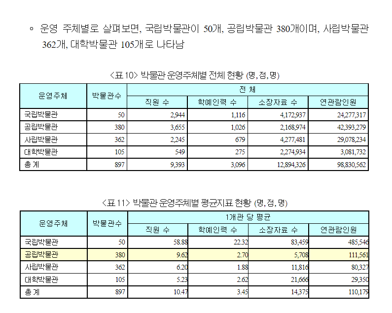공립박물관은 지자체에서 직영 또는 위탁 형태로 운영하는 박물관을 의미한다. 총람에서 제시한 통계자료를 보면, 우리나라 공립박물관의 직원 수는 3,655명이고 이 중 학예인력 수는 1,026명으로 1개관 당 평균 학예인력 수가 2.7명이라고 한다.