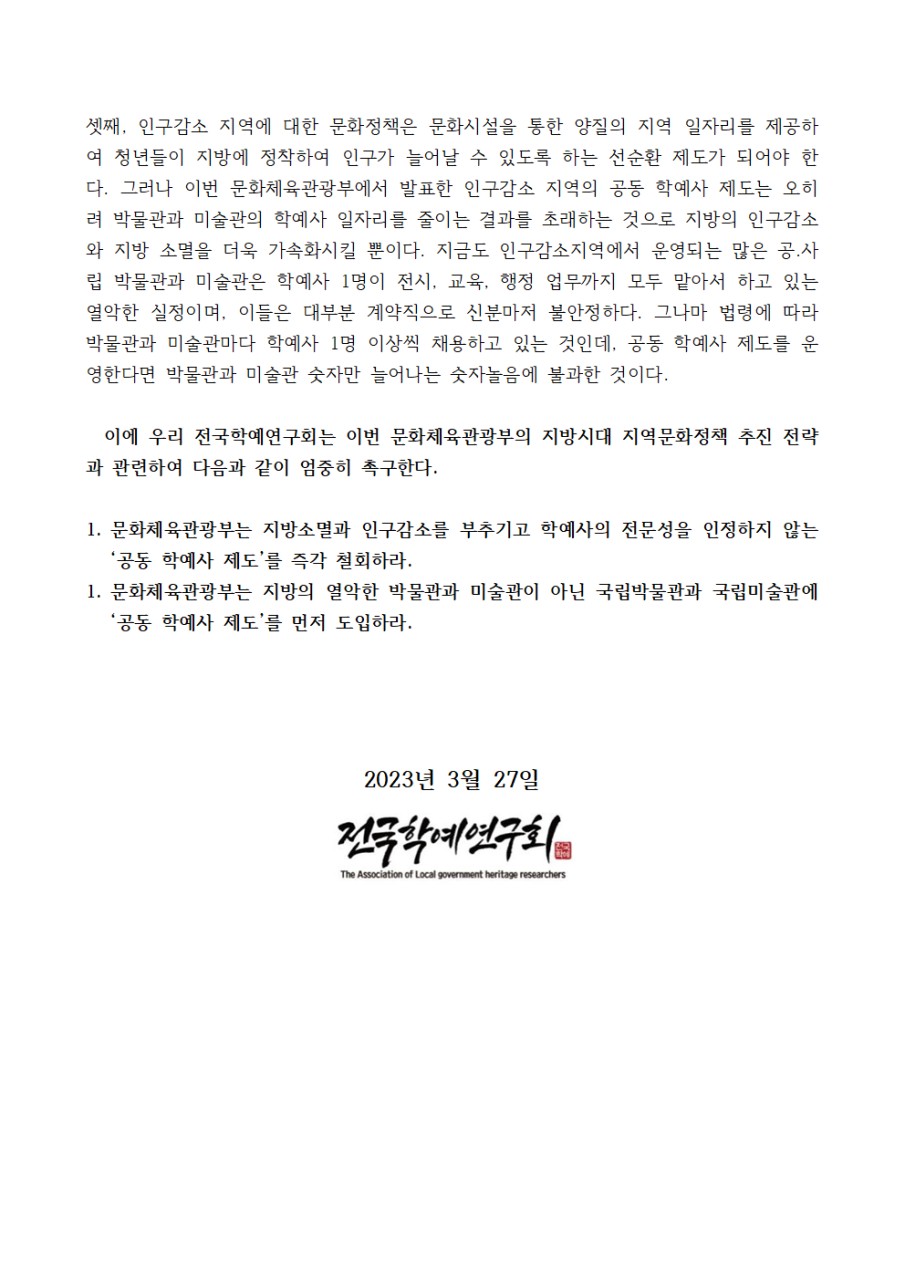 1. 문화체육관광부는 지방소멸과 인구감소를 부추기고 학예사의 전문성을 인정하지 않는 ‘공동 학예사 제도’를 즉각 철회하라.