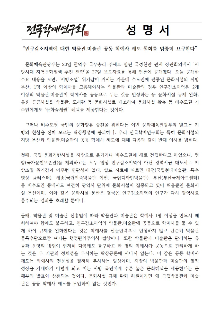 “인구감소지역에 대한 박물관․미술관 공동 학예사 제도 철회를 엄중히 요구한다”