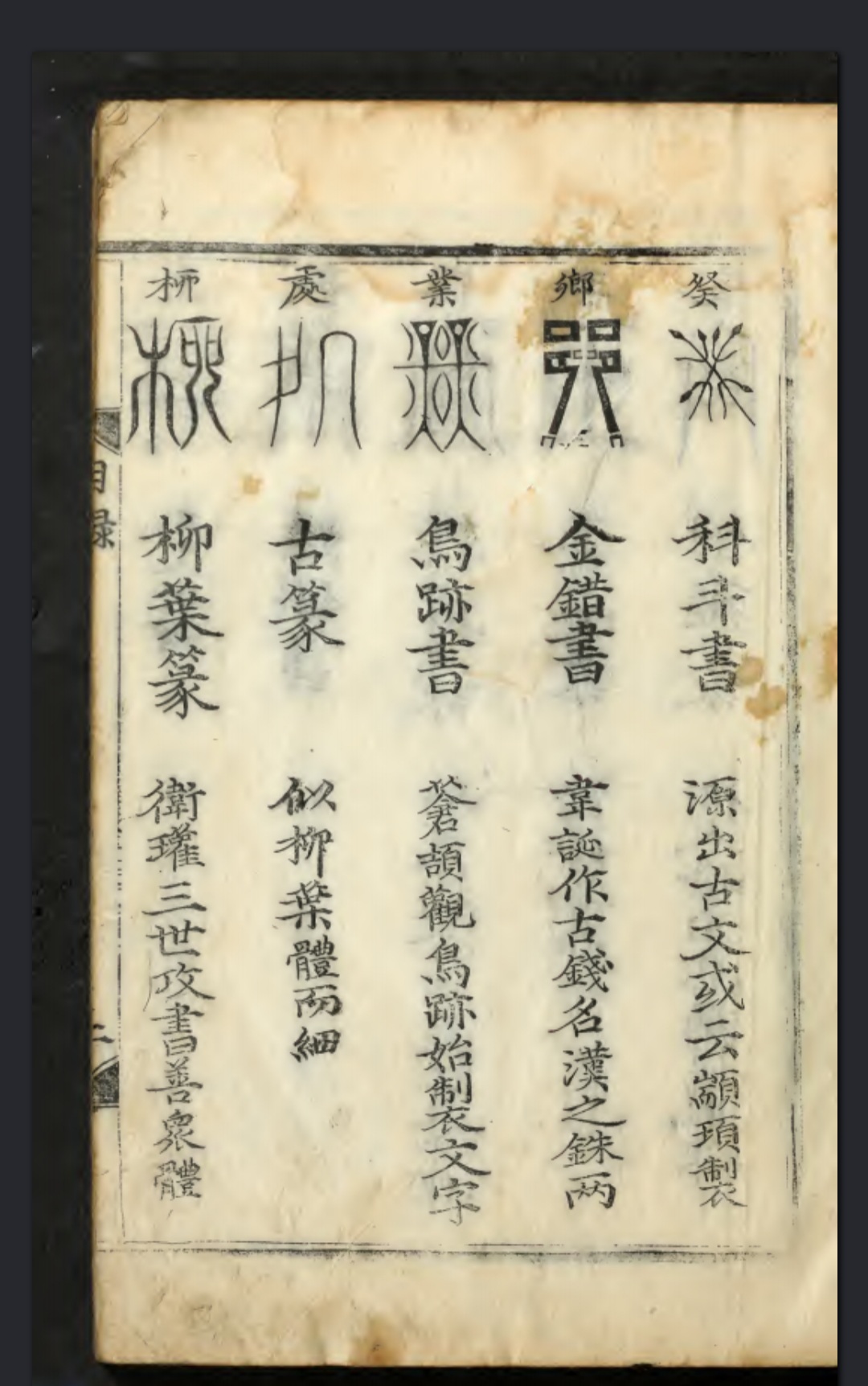 조전(鳥篆) ·상방대전(上方大篆) ·구서(龜書) ·수서(穗書) ·기자전(奇字篆) ·지영전(芝英篆) ·벽락전(碧落篆) ·대전(大篆) ·비백전(飛白篆) ·과두서(科斗書) ·금착서(金錯書) ·조적서(鳥跡書) ·고전(古篆) ·유엽전(柳葉篆) ·수서(殳書) ·현철서(懸銕書) ·전숙전(轉宿篆) ·옥근전(玉筋篆) ·도해전(倒薤篆) ·인서(麟書) ·종정서(鍾鼎書) ·용서(龍書) ·혹두서(鵠頭書) ·정소전(鼎小篆) ·진새전(秦璽篆) ·고정서(古鼎書) ·현침전(懸針篆) ·봉미서(鳳尾書) ·용조전(龍爪篆) ·수운서(垂雲書) ·각부서(刻符書) ·전도전(剪刀篆) ·소전(小篆) ·수로전(垂露篆) ·영락전(纓絡篆) ·태극전(太極篆) 분서(墳書) ·조충전(雕蟲篆)