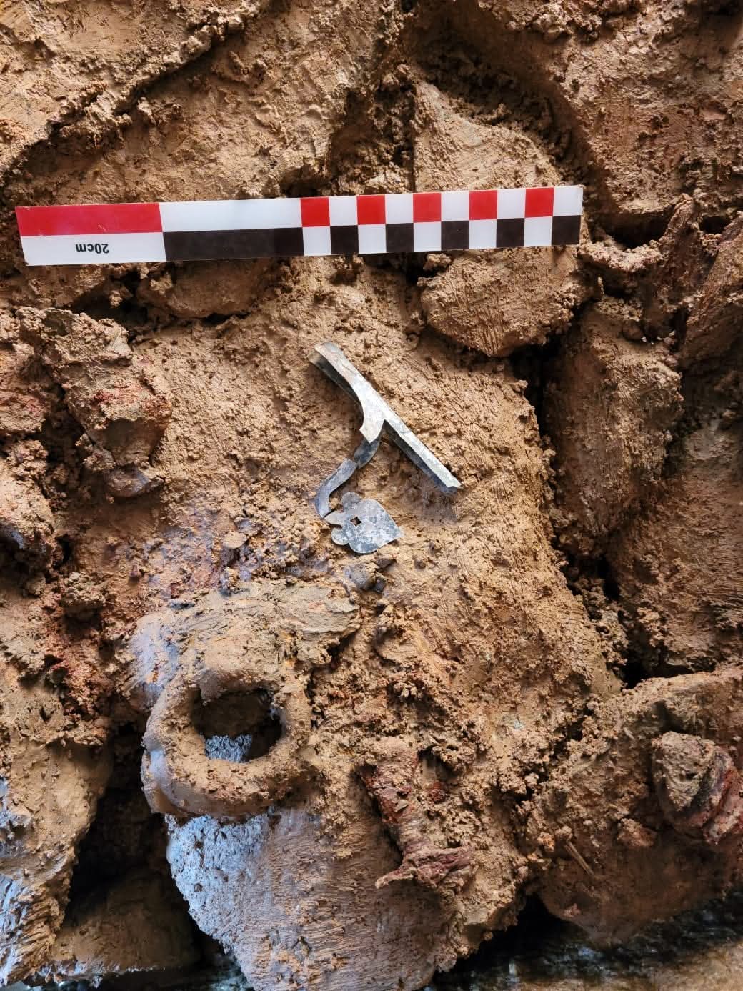 석실 내부를 조사하던 조사원이 장담한 은화관식이 관모테와 함께 출토되었습니다.