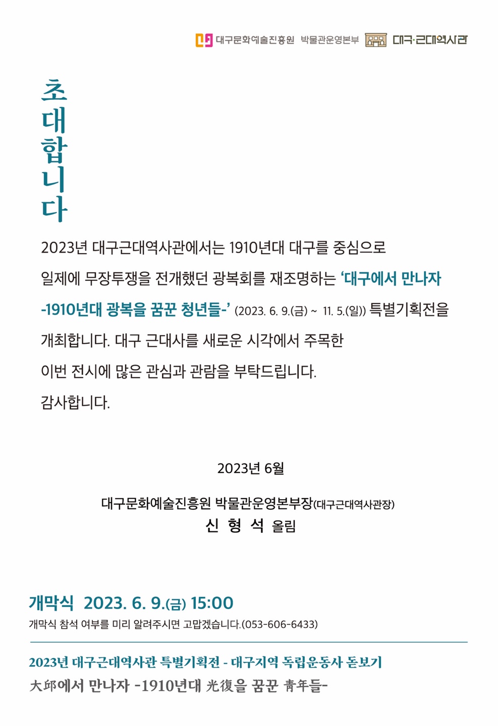 (재)대구문화예술진흥원 박물관운영본부 소속 대구근대역사관은 오는 9일부터 11월 5일까지 ‘대구大邱에서 만나자 -1910년대 광복光復을 꿈꾼 청년靑年들-’ 특별기획전을 2층 기획전시실에서 개최한다.
