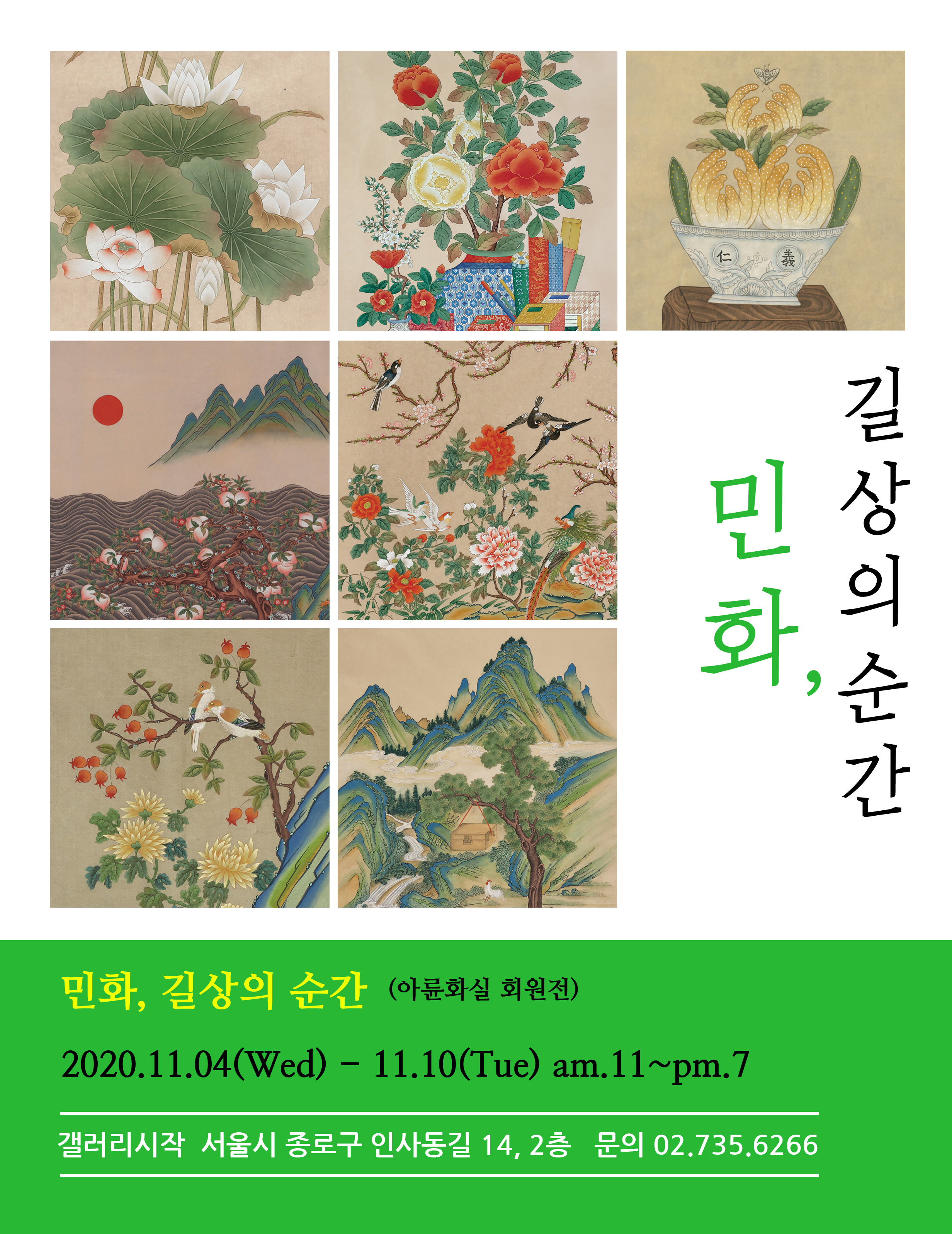 예 그런 민화전이 하나 더 있으니 아륜화실이라는 데를 근거로 삼는 민화작가들이 <민화, 길상의 순간>이라는 슬로건 아래 전시를 한다거니와 오늘 개막해 오는 10일까지 갤러리시작 이라는 데서 한단다.