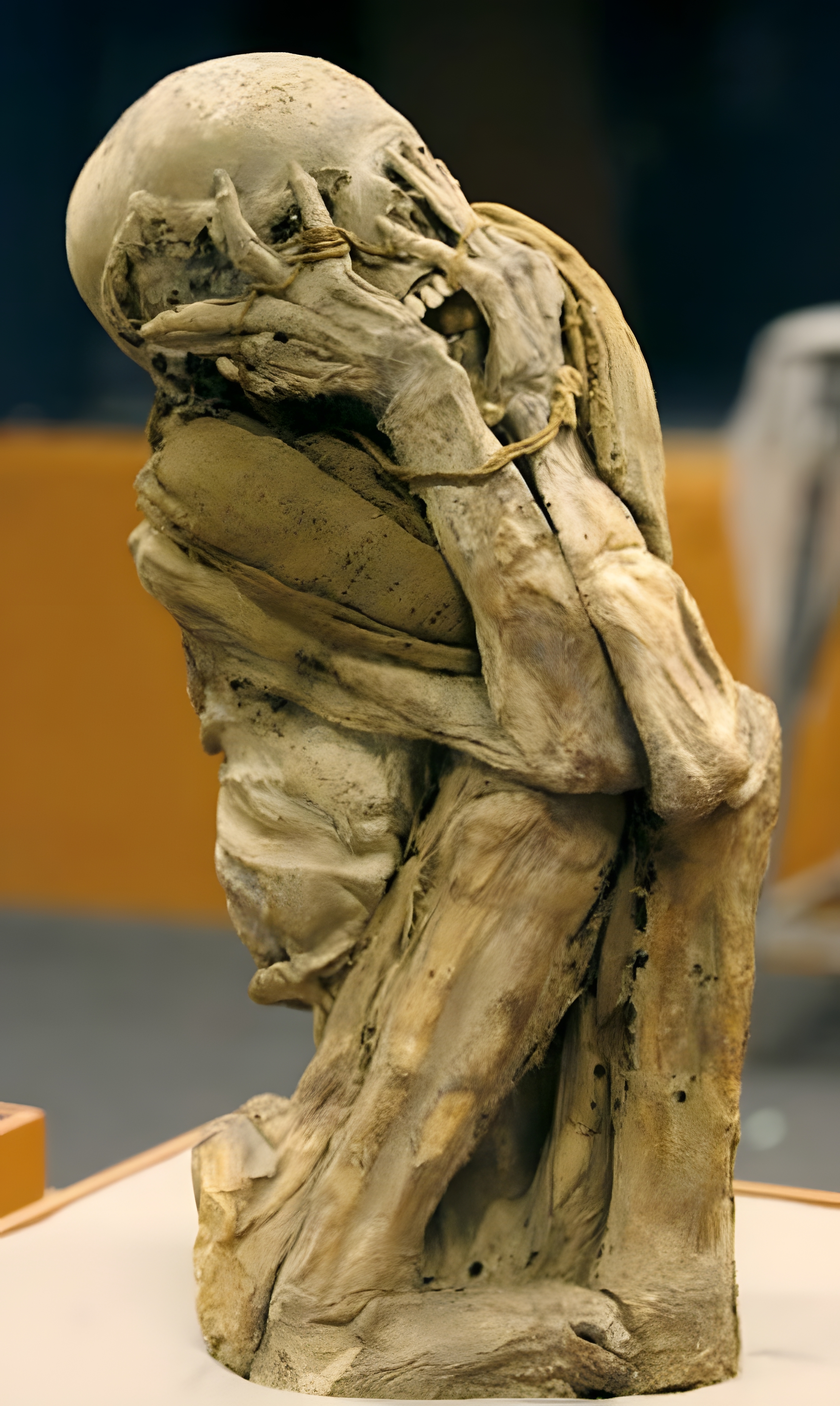 이 미라가 이러한 자세로 만들어진 것은 사망 후 사후 강직이 이루어지는 시간을 피해 후손들이 저 자세로 염을 했기 때문이다.