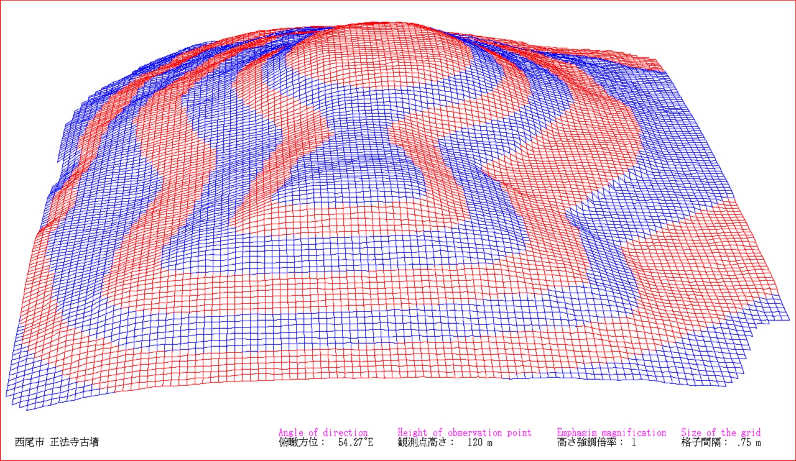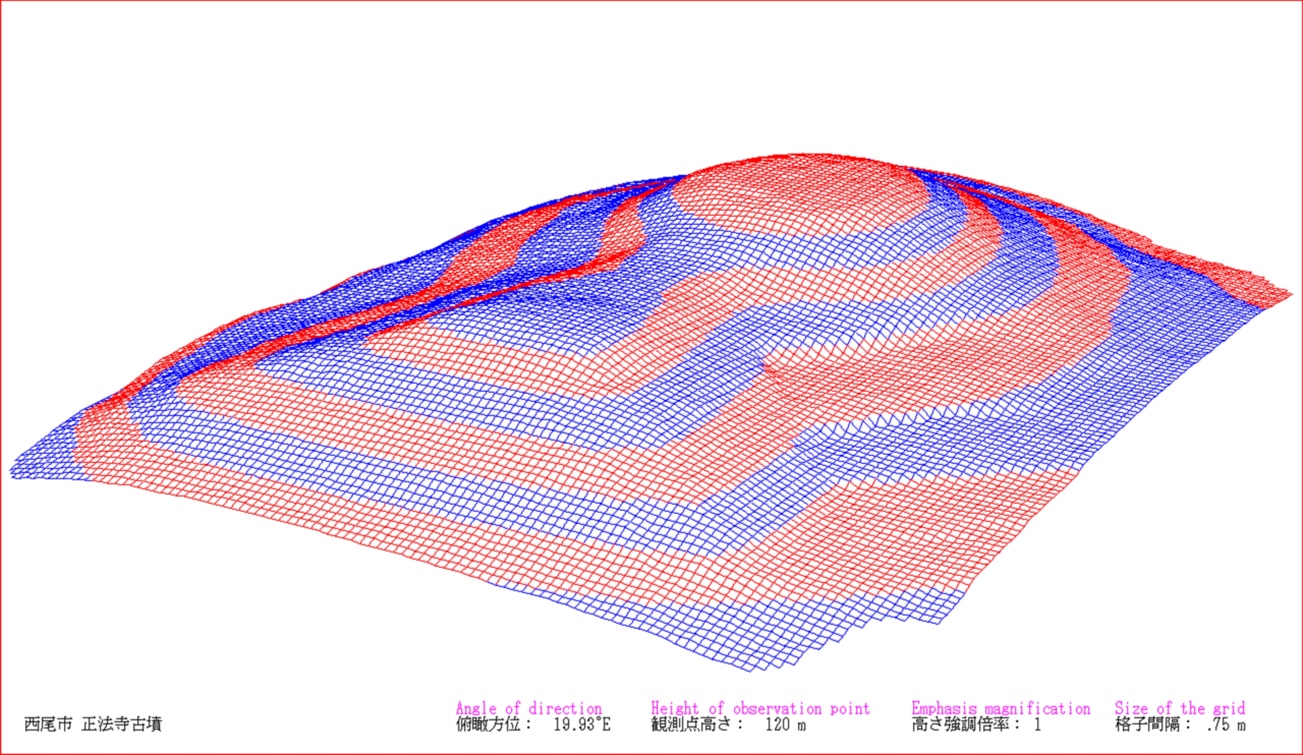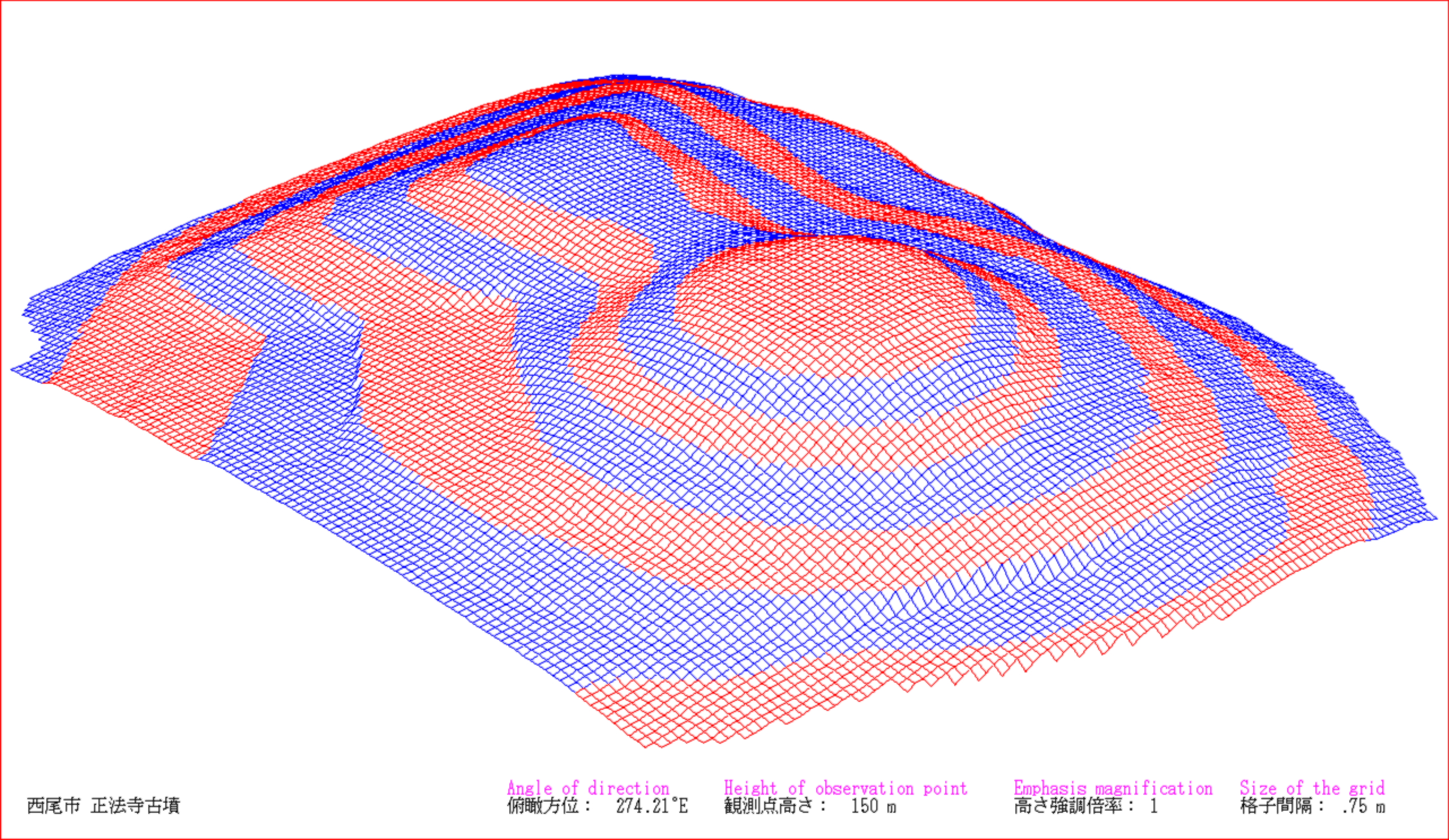 분구墳丘는 3단 축성이라 다른 전방후원분과 통하지만 보다시피 남북 주축선도 뒤틀리고 그 때문에 좌우 대칭이 성립하지 않는다.