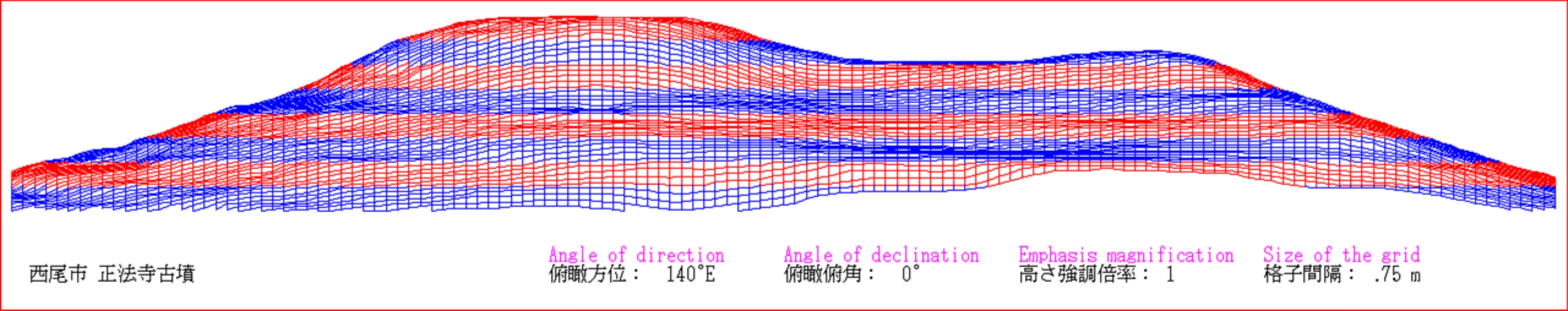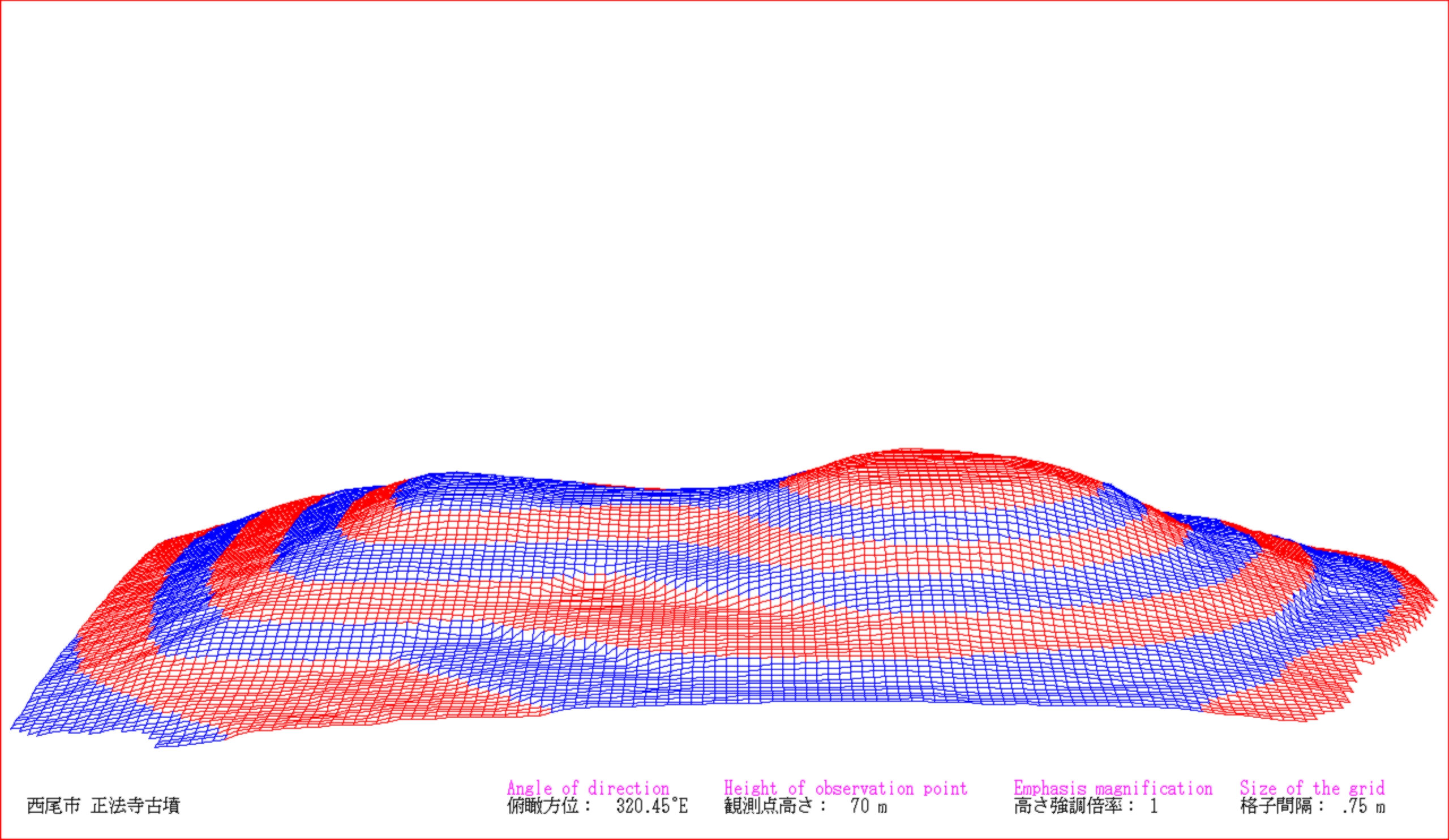분구墳丘는 3단 축성이라 다른 전방후원분과 통하지만 보다시피 남북 주축선도 뒤틀리고 그 때문에 좌우 대칭이 성립하지 않는다.