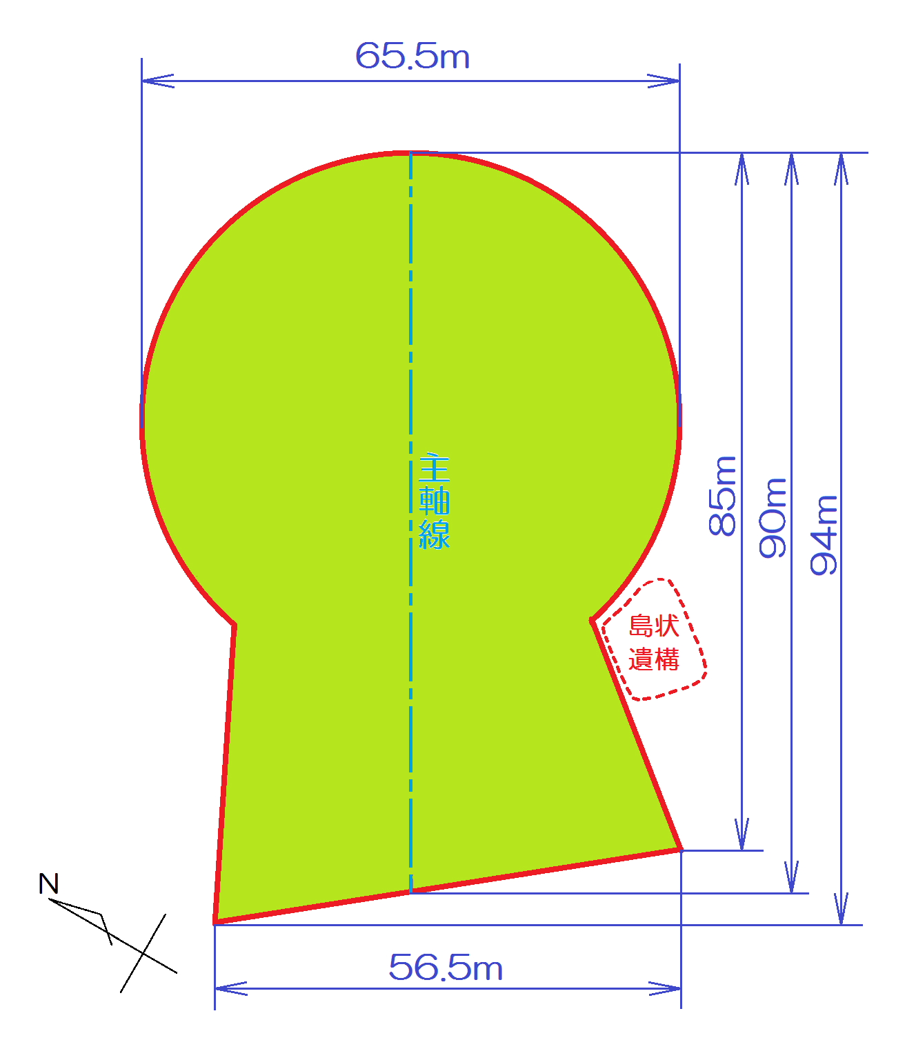 후원부後円部 지름은 65.5m. 쿠비레부くびれ部는 폭 44m. 전방부 너비는 56.5m.