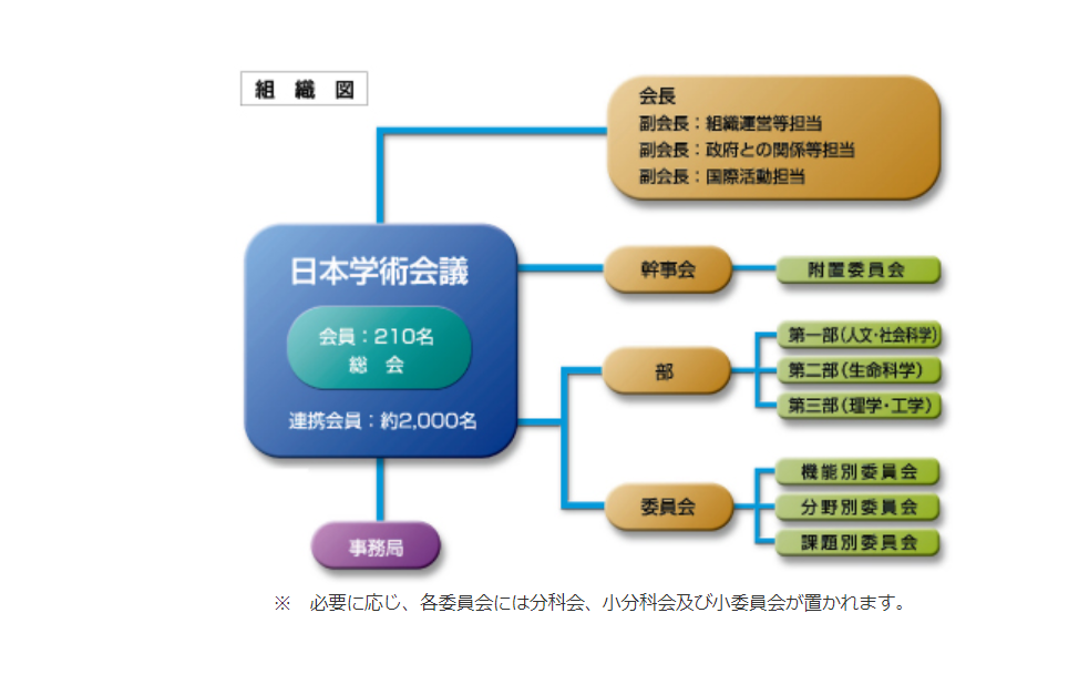 일본학술회의는 우리나라의 인문·사회과학·생명과학生命科学·이학理学·공학의 전 분야 약 87만 과학자를 안팎으로 대표하는 기관으로, 회원 210명과 약 2천명의 연대 회원으로 직무가 분담된다.