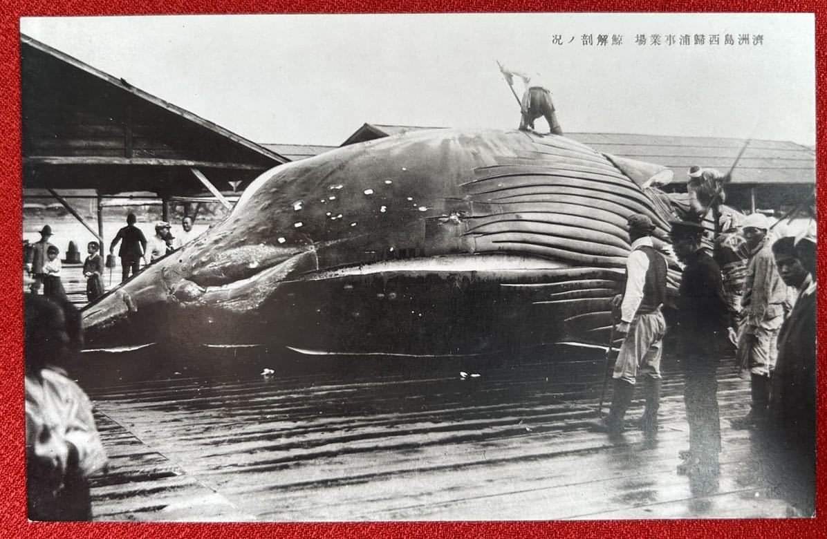 어떤 누리집에서 본 일제강점기 엽서 사진. 제주 서귀포 '사업장'에서 고래를 해체하는 모습이라는 설명이 붙었다.