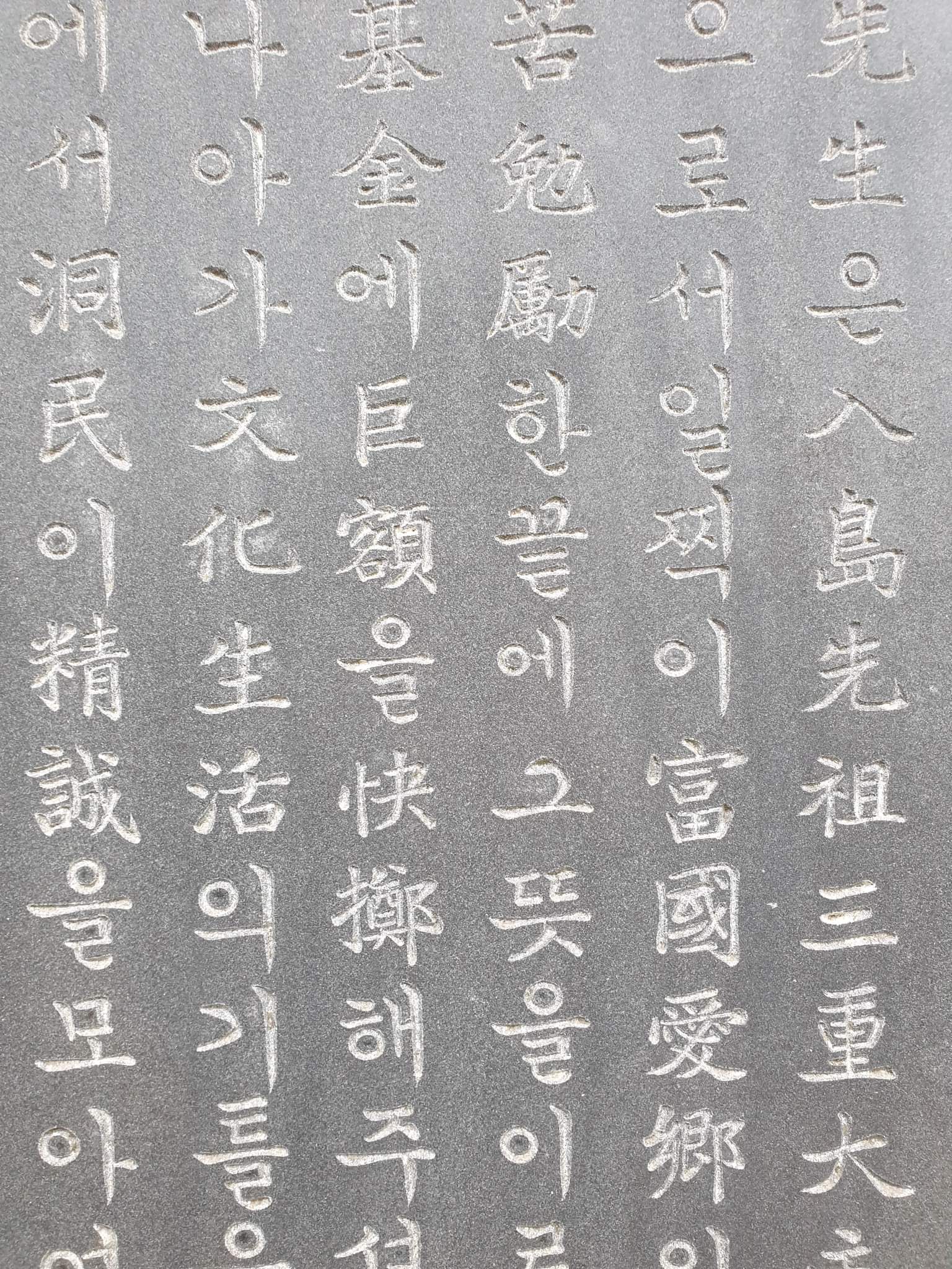 그런데 여기 있는 비석 중 하나는 그중에서도 꽤 독특한 위상을 갖고 있다. 일부러 육지에서 돌을 갖고 오고 육지 명필 일중一中 김충현金忠顯(1921~2006)의 글씨를 받아 세운 비석이기 때문이다.