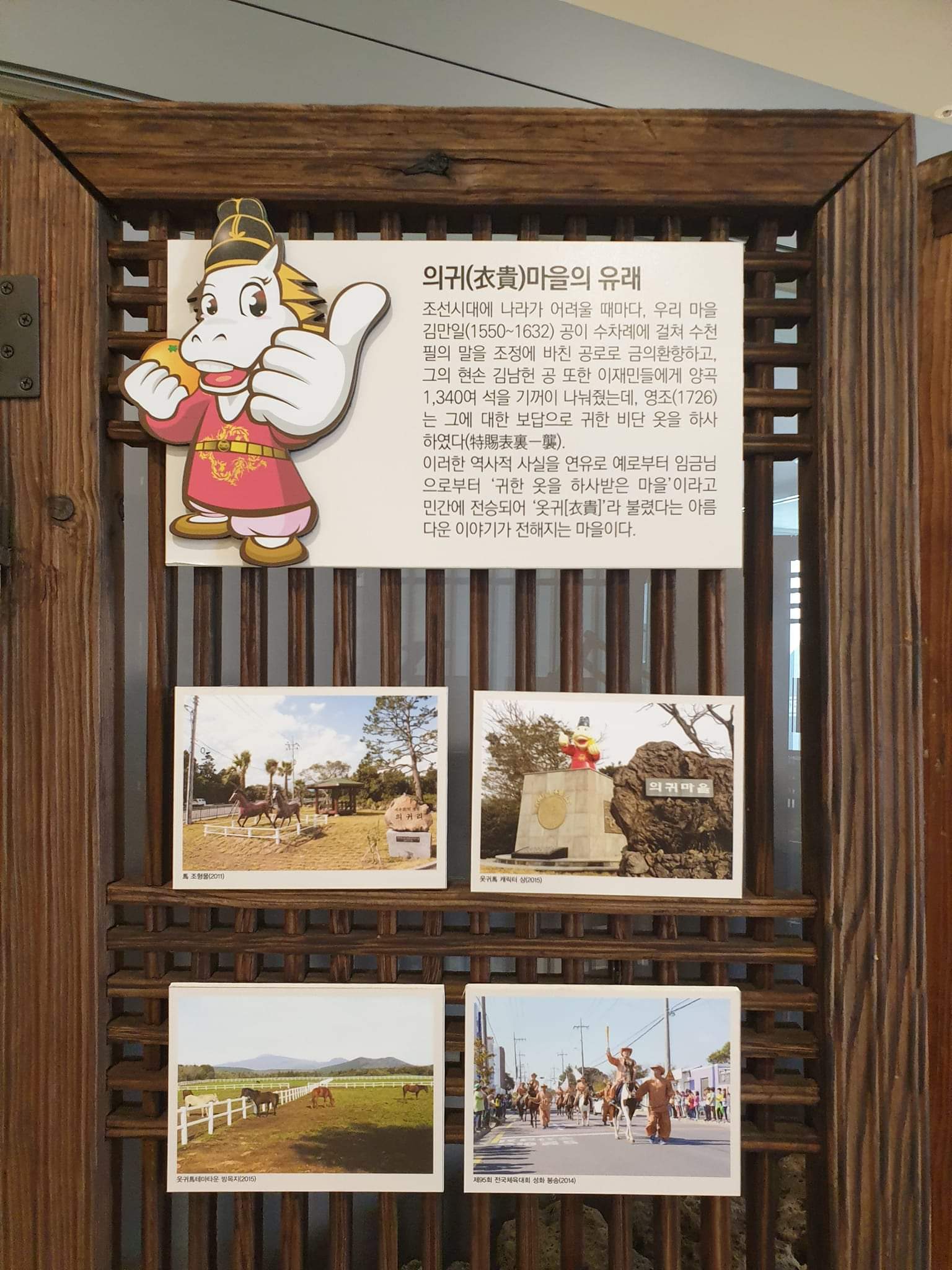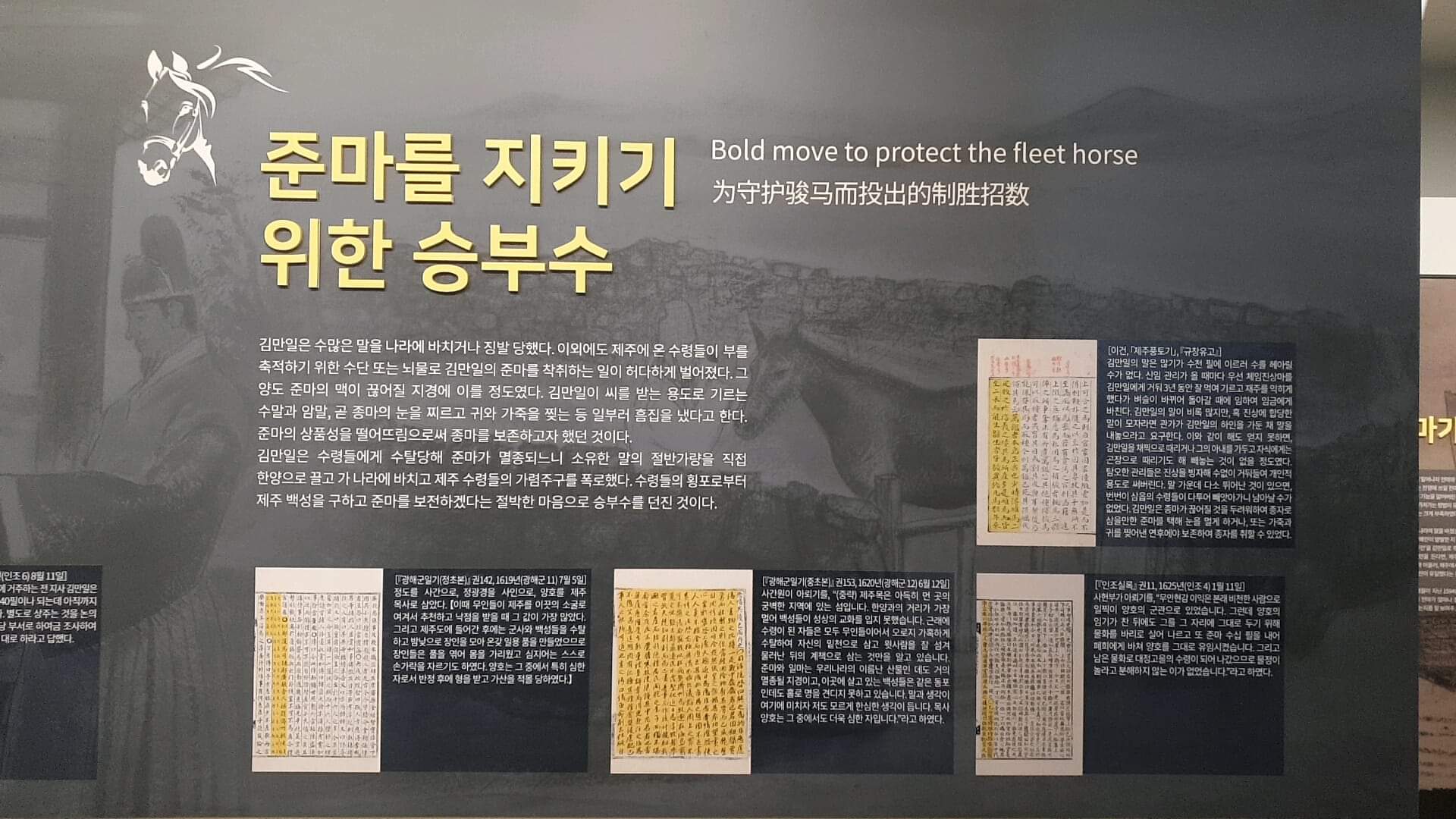 2. 서귀포시 남원읍 의귀리 출신인 김만일은 제주에서 말을 엄청나게 길러냈던 인물이다. 그가 처음 기른 한 마리 숫말이 도망갔다가 암말 80여 마리를 이끌고 돌아왔다는 전설이 전해지는데, 기록으로 남은 그의 진헌進獻 말 두수만 해도 천 마리는 가뿐히 넘는다. 그는 임진왜란 당시 조정에 말 수백 마리를 바쳤고, 이후에도 필요할 때마다 목장에서 기르던 말을 바치곤 했다. 요즘으로 치면...전차 공장이나 자동차 공장의 공장장이었다고 해야 할까?