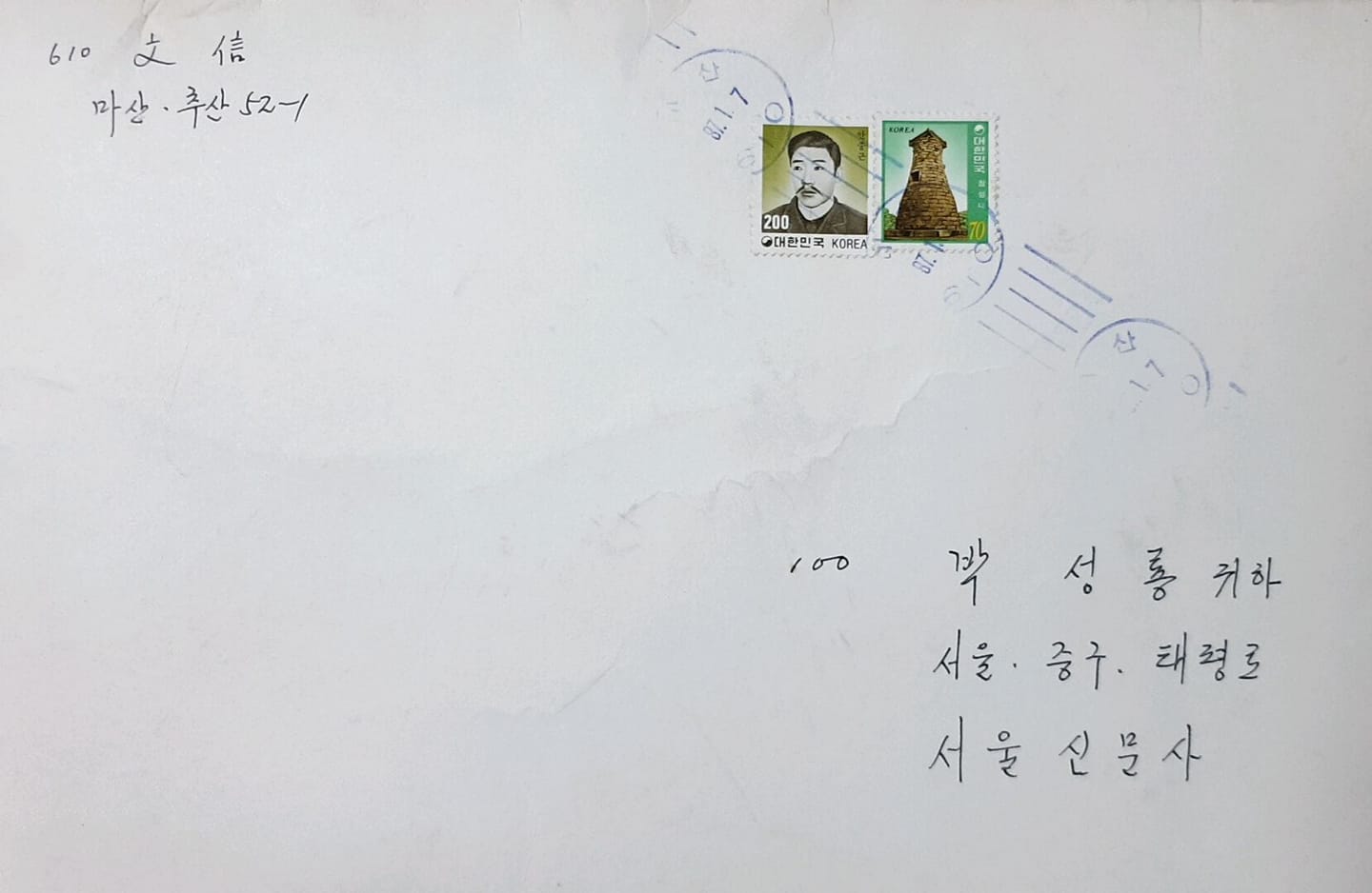 1. 군사정권이 무너지지 않을 것만 같았던 1987년 1월 7일, 마산 추산동 52-1에 살던 조각가 문신文信(1922-1995) 선생은 서울신문사에 근무하던 시인 박성룡(1932-2002) 선생에게 무언가를 보내야 했다. 문선생은 단아한 필체로 자기와 받는이의 이름과 주소를 두꺼운 종이봉투에 적고, 봉투 안에 무언가를 넣어 봉했다. 그리고 그것을 우체국에 갖고 가 서울로 부쳤다.