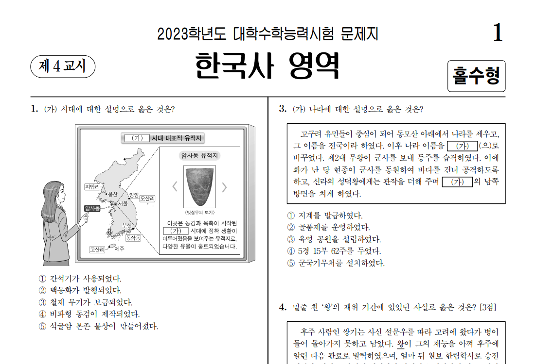 보다시피 2023학년도 대학수학능력시험 문제지 4교시 한국사영역이라 그 첫번째 문항으로 서울 암사동 유적 중에서도 신석기시대 부문만 꼴랑 집어내고서는 그 대표 유물이라는 빗살무늬토기 하나 그림으로 제시하면서 그 시대상에 부합하는 답안을 구하라고 한다.