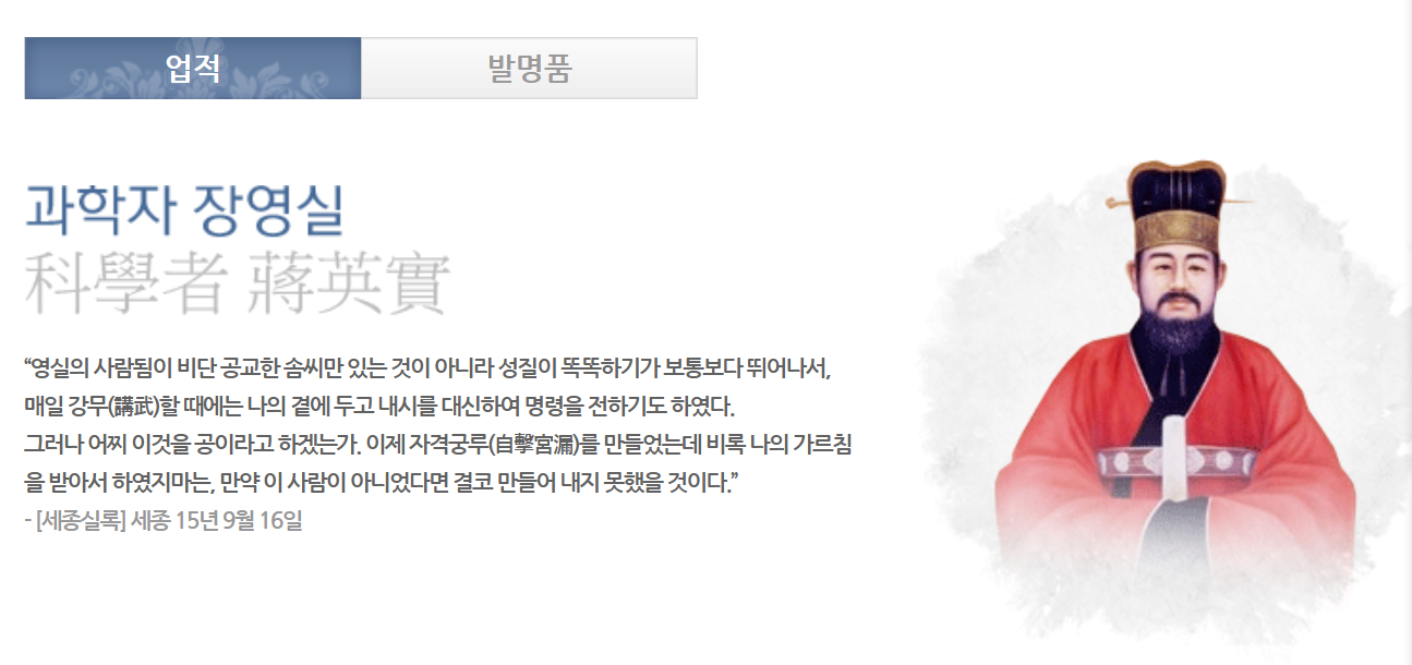 신분의 한계를 오로지 기술 하나로 극복하고자 몸부림쳤으며, 이 과정에서 자격루와 흠경각 제작이라는 불후의 업적을 남겼다.