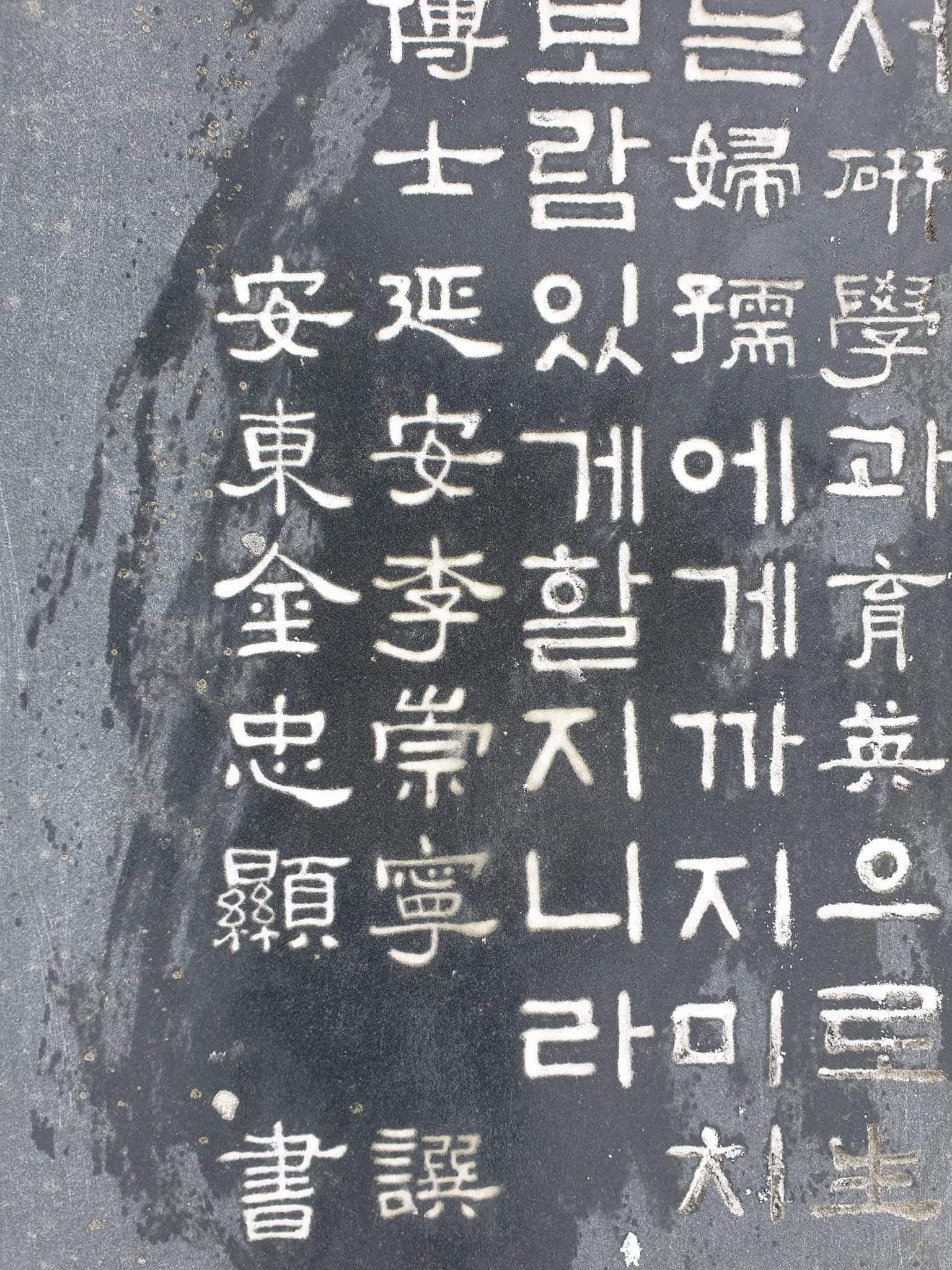 김충현이 즐겨 쓴 예서와 고체古體인데, 40대 글씨라 그런지 원숙한 느낌은 아니다. 실험작에 가깝다 해야할까. 눈으로 비문을 쓸어 채우니 탁본처럼 글자가 선명해진다.