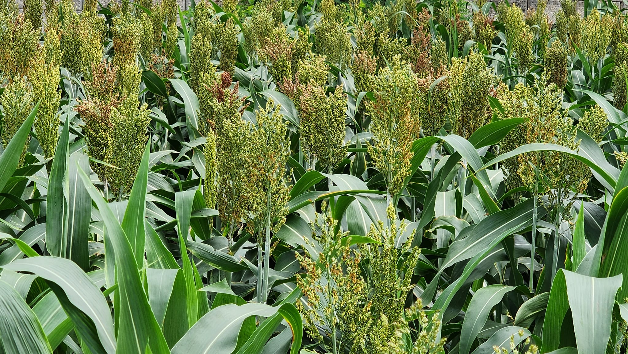 사진 속 수수 이삭머리에 갈색은 수수가 익는 게 아니고 새가 찧어, 녹말 즙을 짜내 색이 붉게 변한 자국이다.