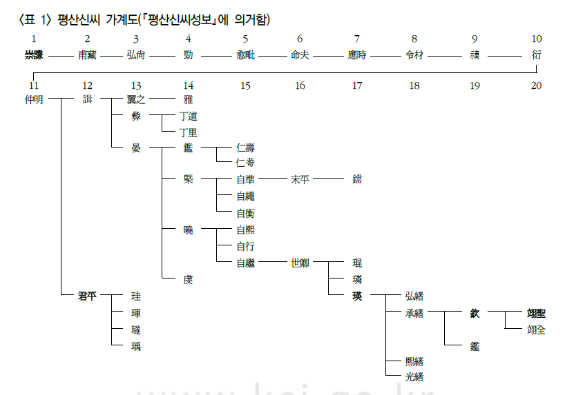 위 평산신씨의 계보를 보면 시조인 신숭겸 부터 11세까지가 단계로만 내려오는데