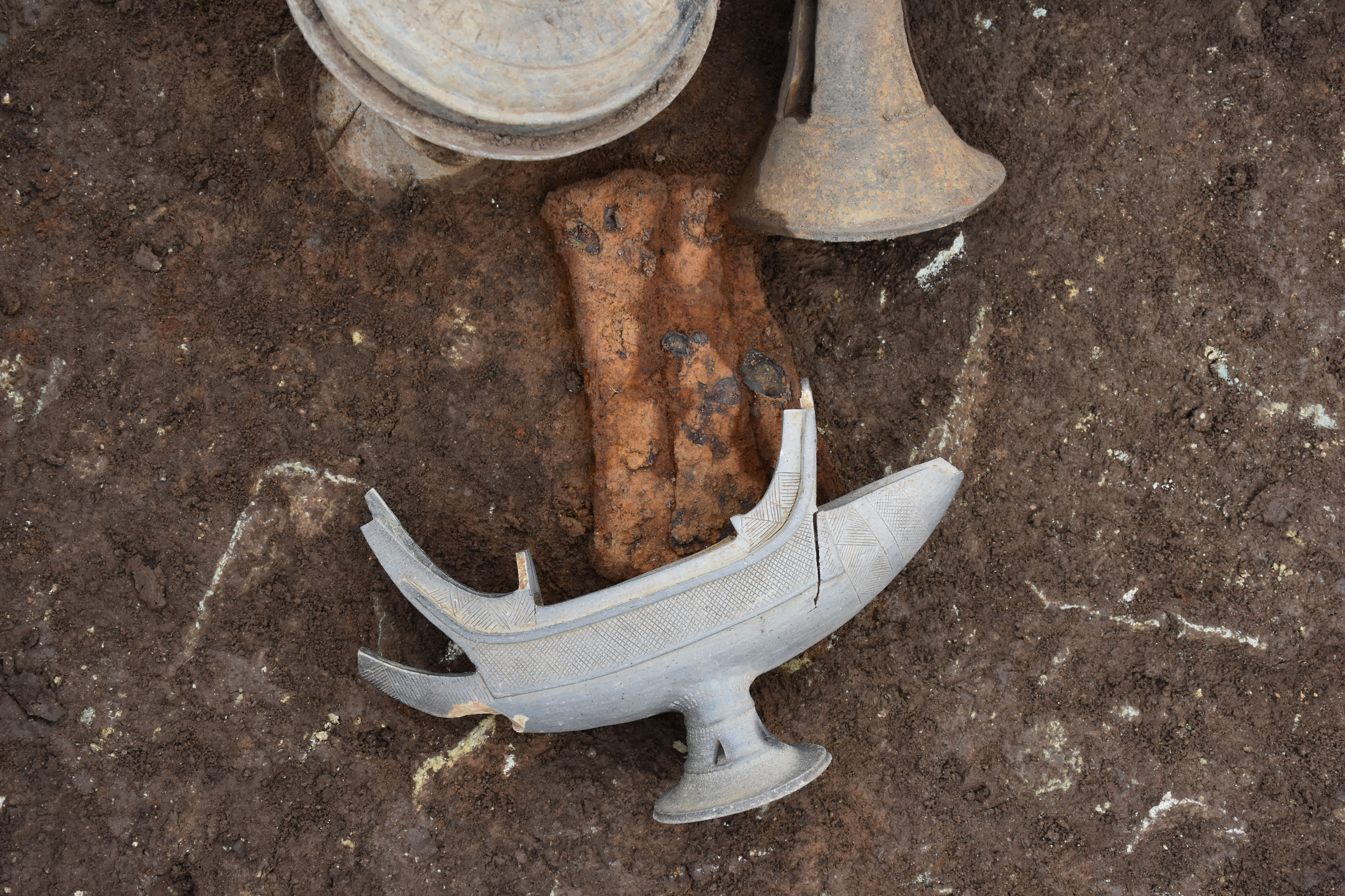 피장자 머리 근처 덩이쇠 다발 위쪽에서 모습을 드러낸 배모양토기는 길이 29.2㎝·높이 18.3㎝이다. 형태는 단순한 통나무배에서 구조가 복잡한 구조선으로 나아가는 중간 단계인 준구조선으로 파악됐다.