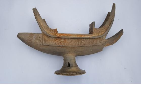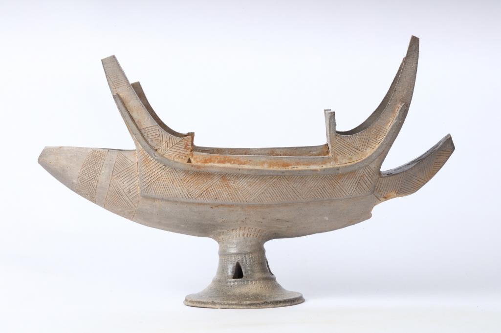 길이 29.2㎝, 높이 18.3㎝ 크기의 배모양토기는 선체 모양 토기 아랫부분에 굽다리(臺脚)를 붙여 세울 수 있다.