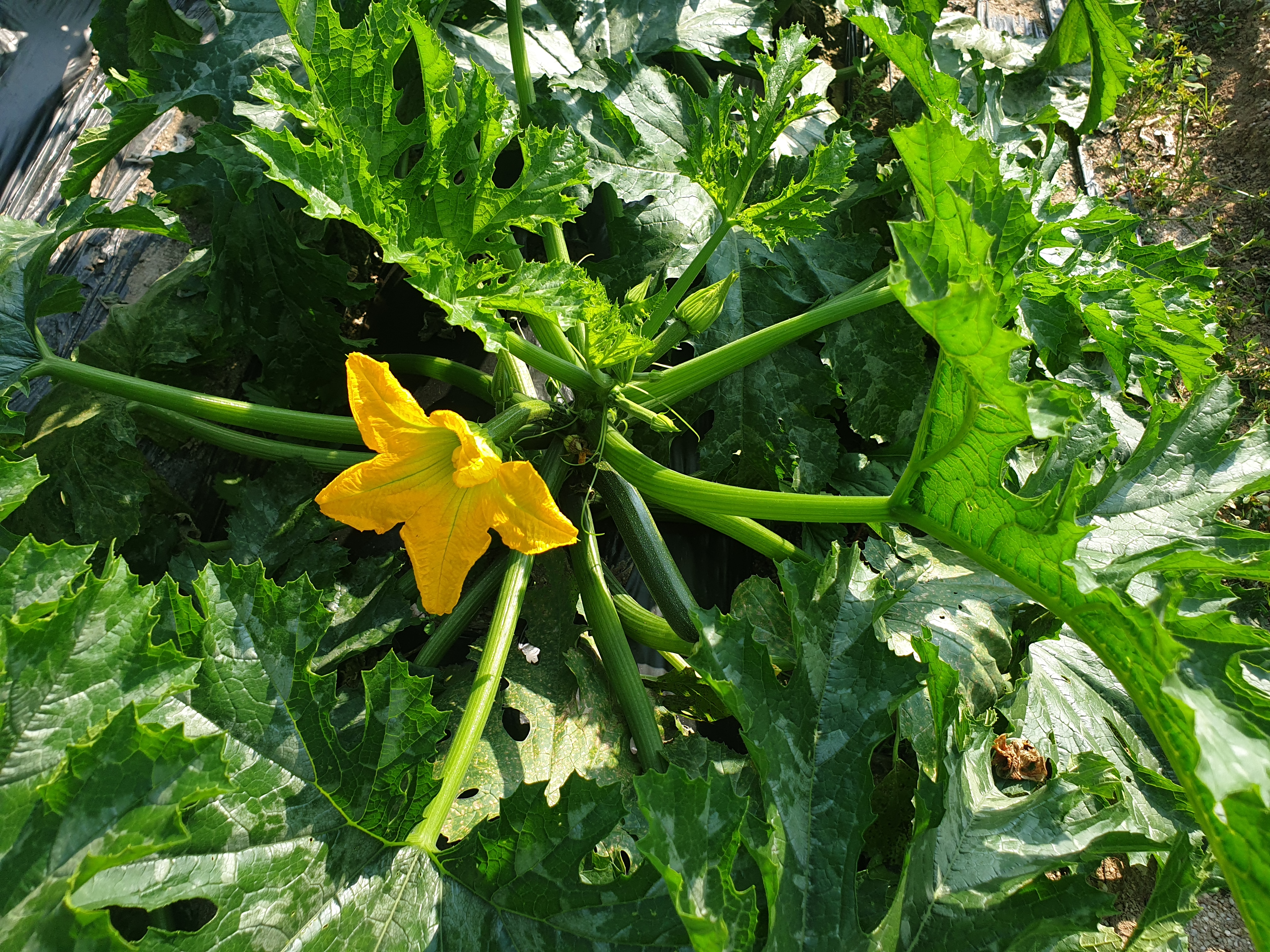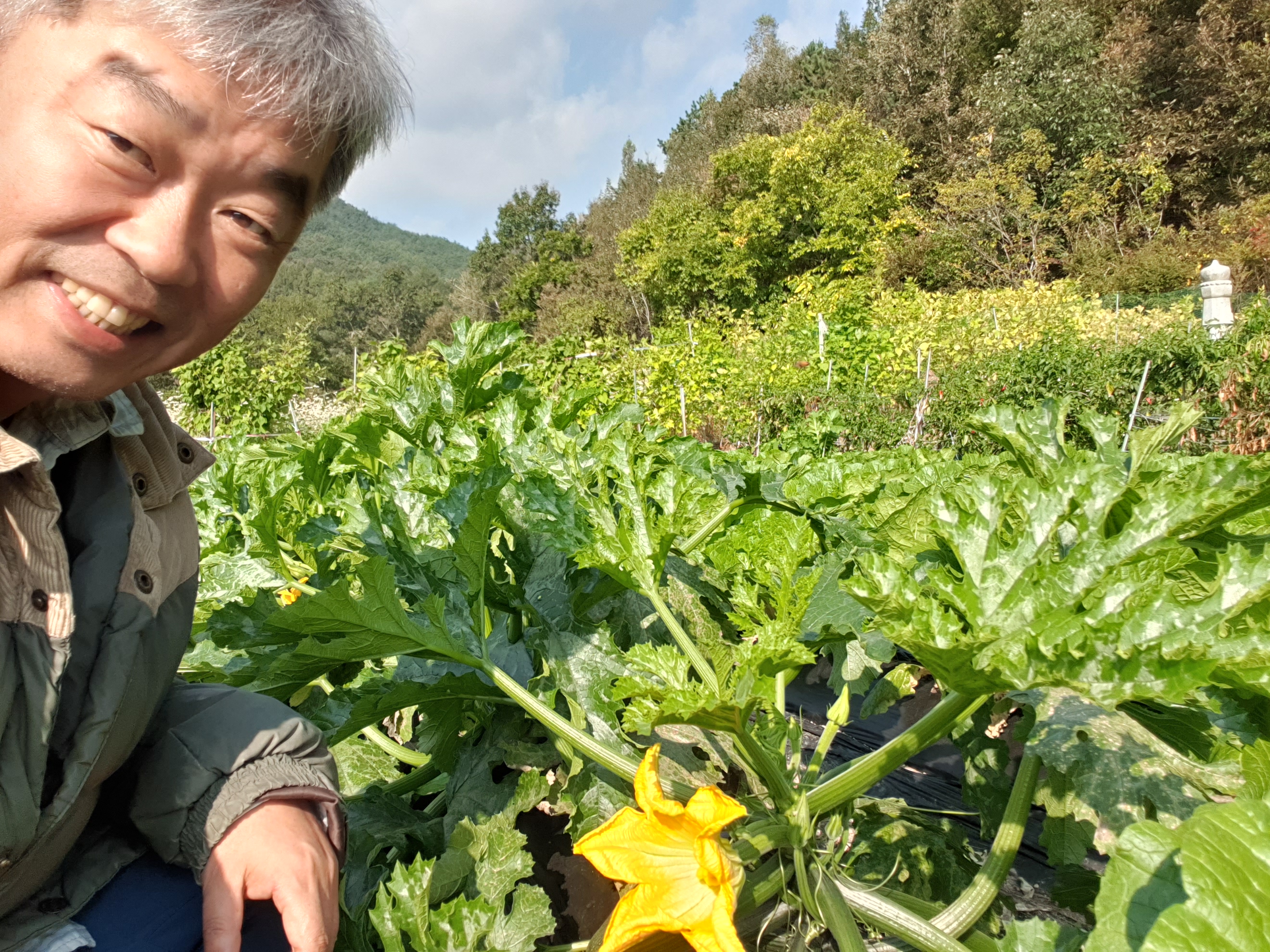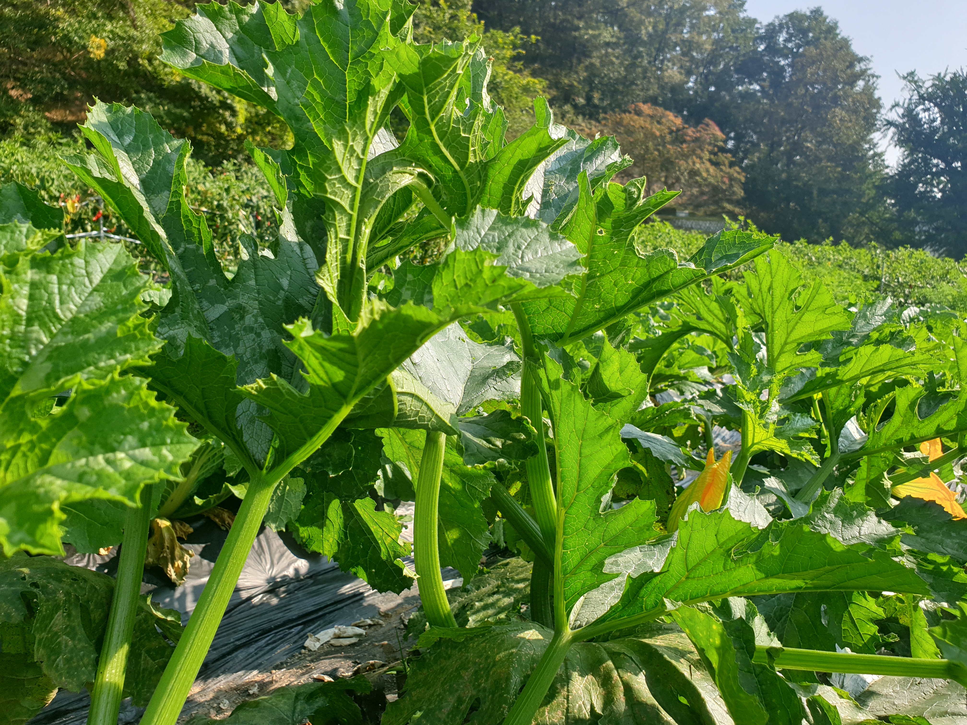 어째 이 놈 폼새가 심상찮아 그 자란 모습이 무슨 열대 우림을 보는 듯 하더니만 1미터 정도나 키가 큰단다. 종래 우리한테 익숙한 호박이 옆으로 그리고 다른 나무 같은 지물을 이용해 뻗어 나가는데 견주어 이놈들은 파초처럼 자란다.