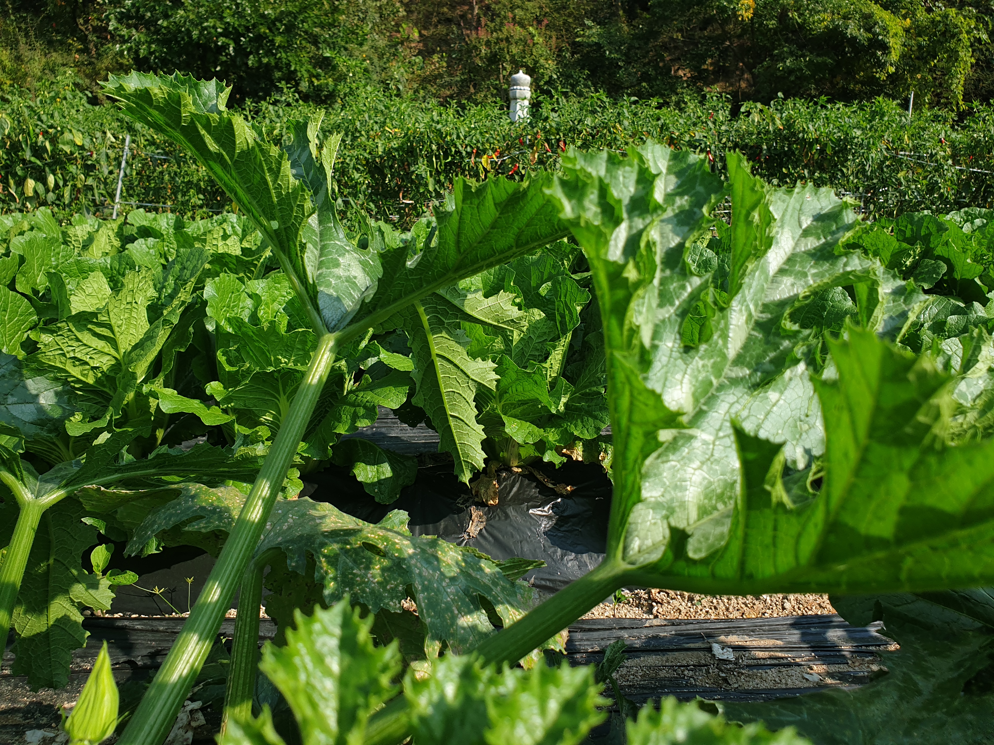 어째 이 놈 폼새가 심상찮아 그 자란 모습이 무슨 열대 우림을 보는 듯 하더니만 1미터 정도나 키가 큰단다. 종래 우리한테 익숙한 호박이 옆으로 그리고 다른 나무 같은 지물을 이용해 뻗어 나가는데 견주어 이놈들은 파초처럼 자란다.