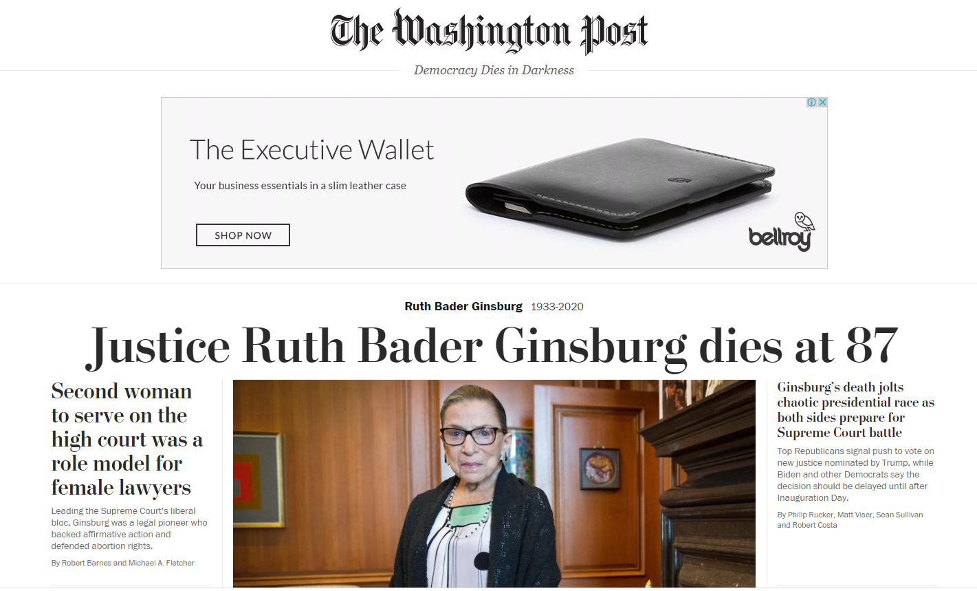 미국 연방대법관 긴즈버그가 죽자 뉴욕타임즈 the New York Times 는 이런 미다시를 뽑았다. 그대로 옮기면 다음과 같다.
