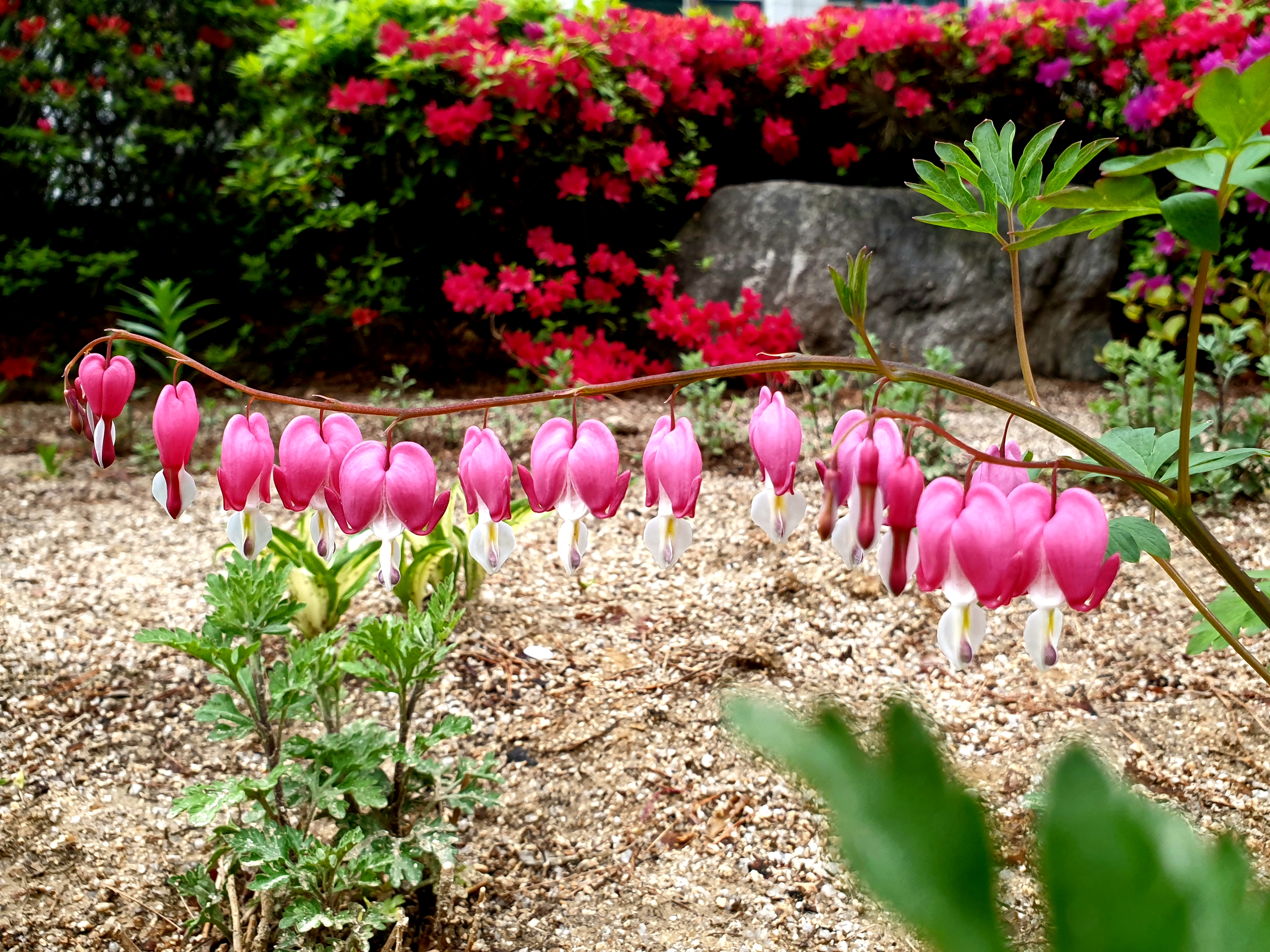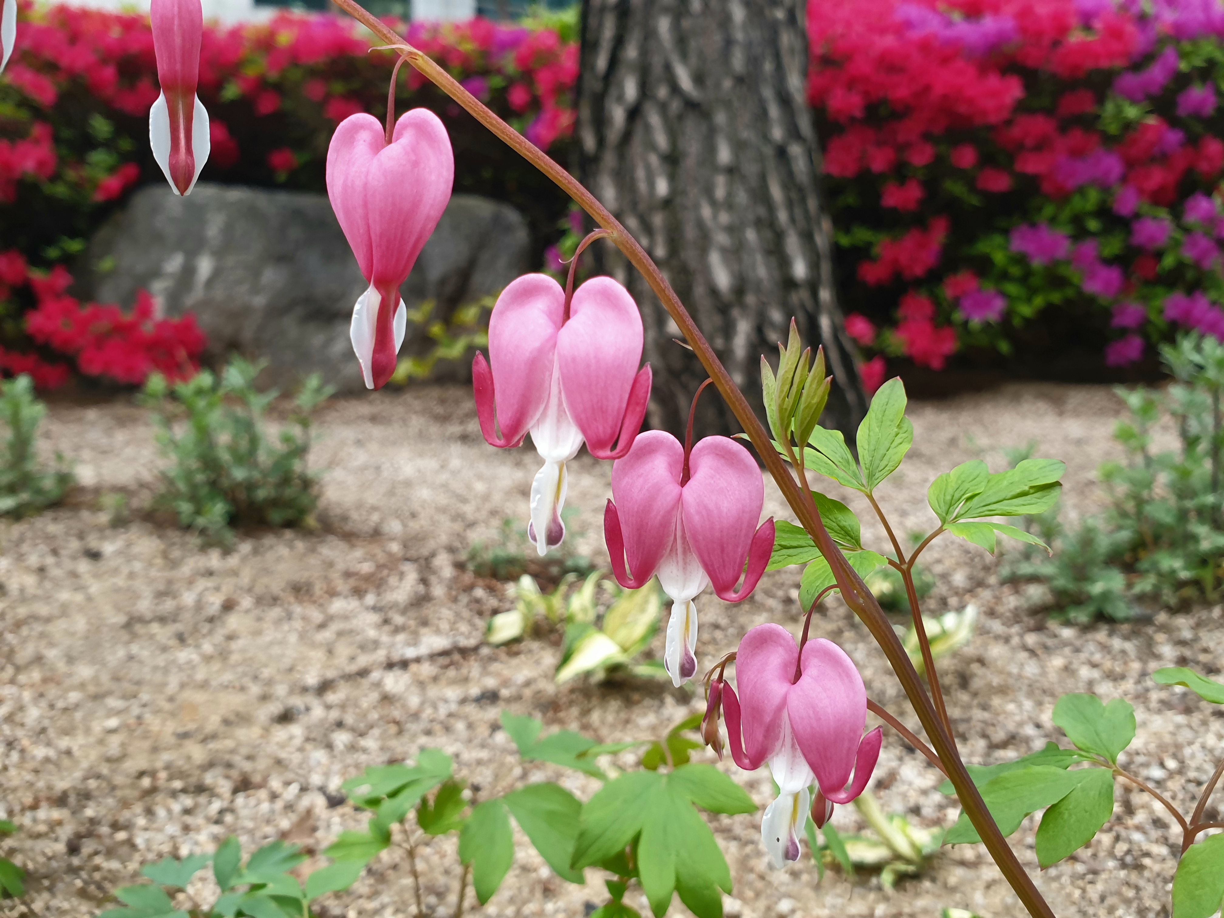 꽃 생김이 비단주머니, 금낭錦囊 같은 꽃술이 줄줄이 달린다 해서 금낭화라 일컫는다.