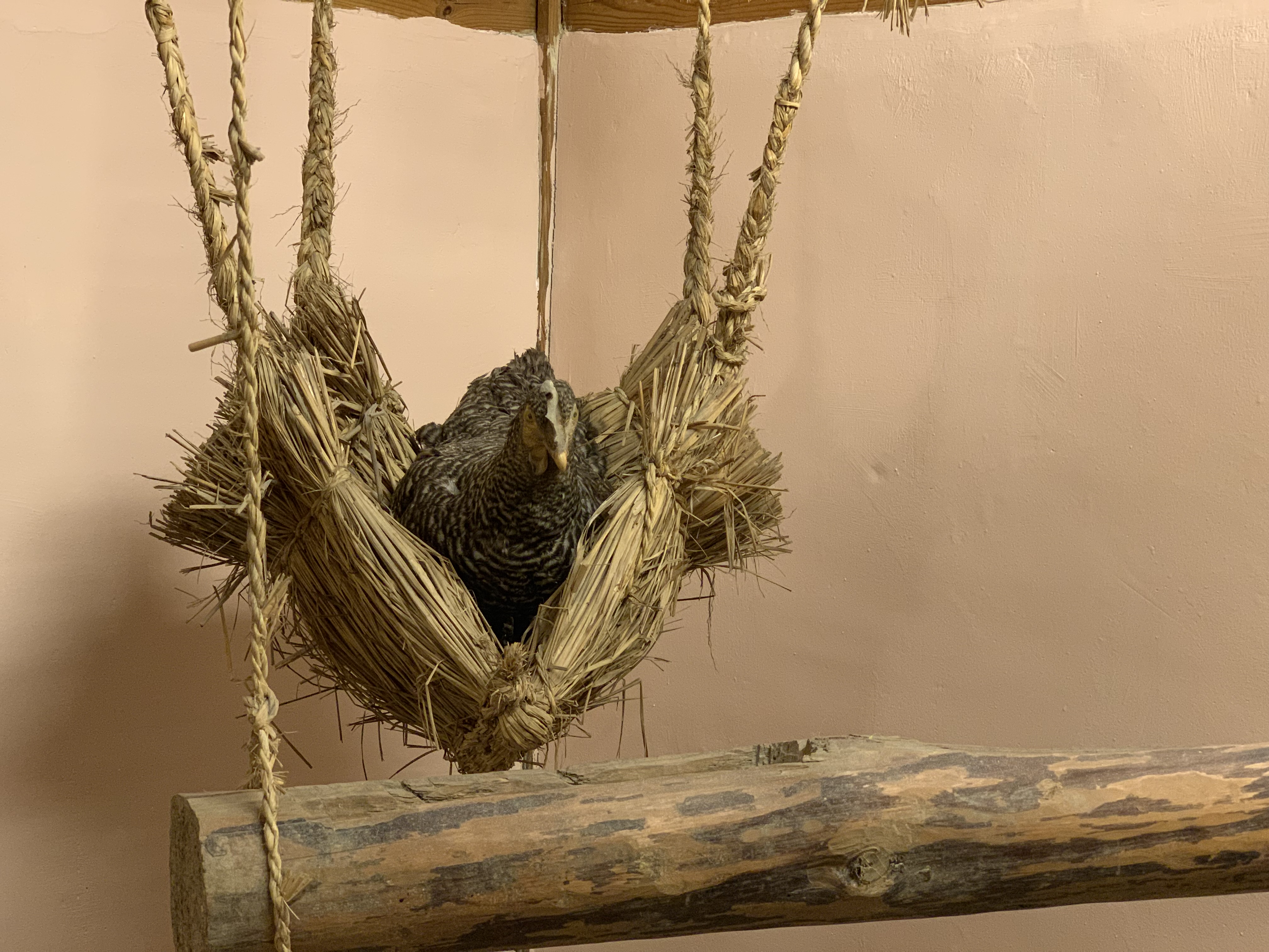 대나무를 길게 타원형으로 엮고, 그 안에 횃대 두 개를 설치했어요. 엄마따라 아기 병아리들도 같이 들어가 살았지요. 밤에 잘 때는 짐승들로 부터 엄마 닭과 병아리를 지켜주기위해 문을 닫아 주었어요.