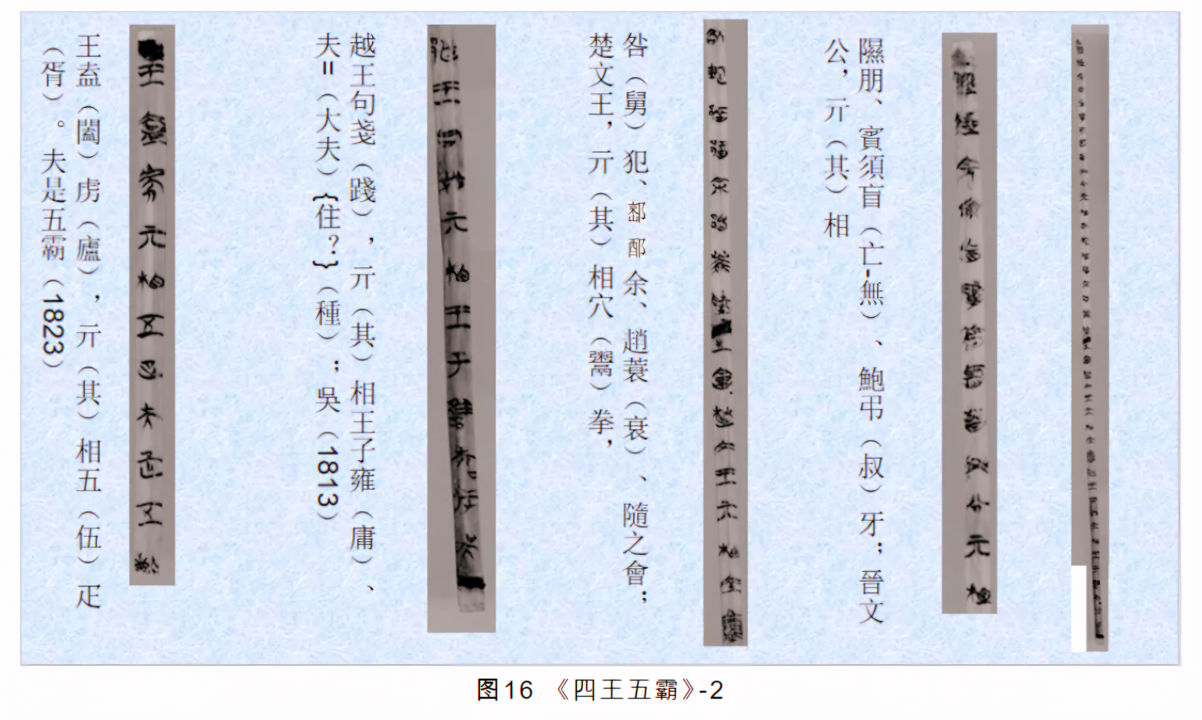 간문简文은 우虞·夏·商·周 4대 제왕 사적事迹을 열거하면서 아울러 “오패五霸”와 그 보좌 재상들 이름을 열거한다(图15·16).