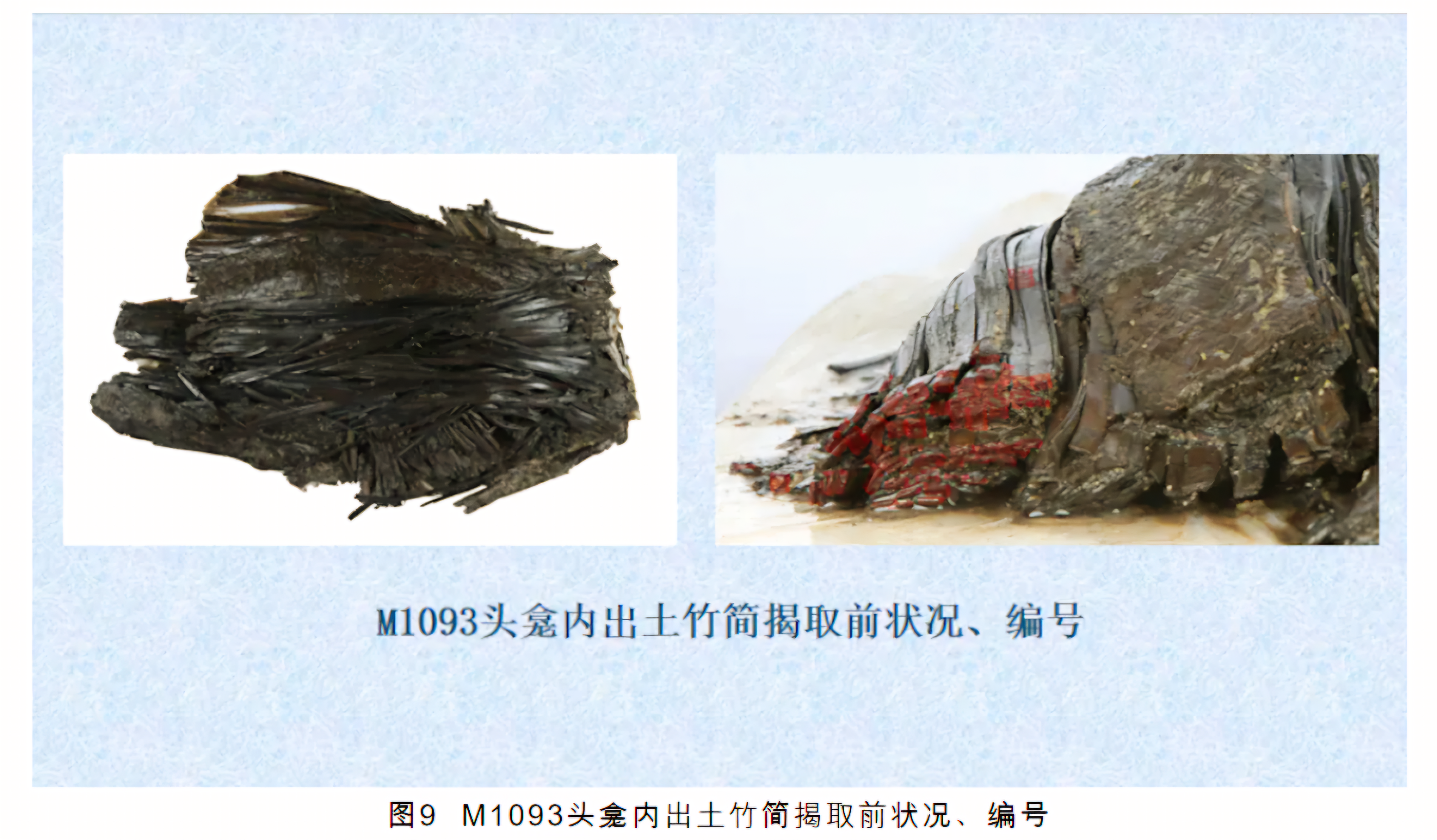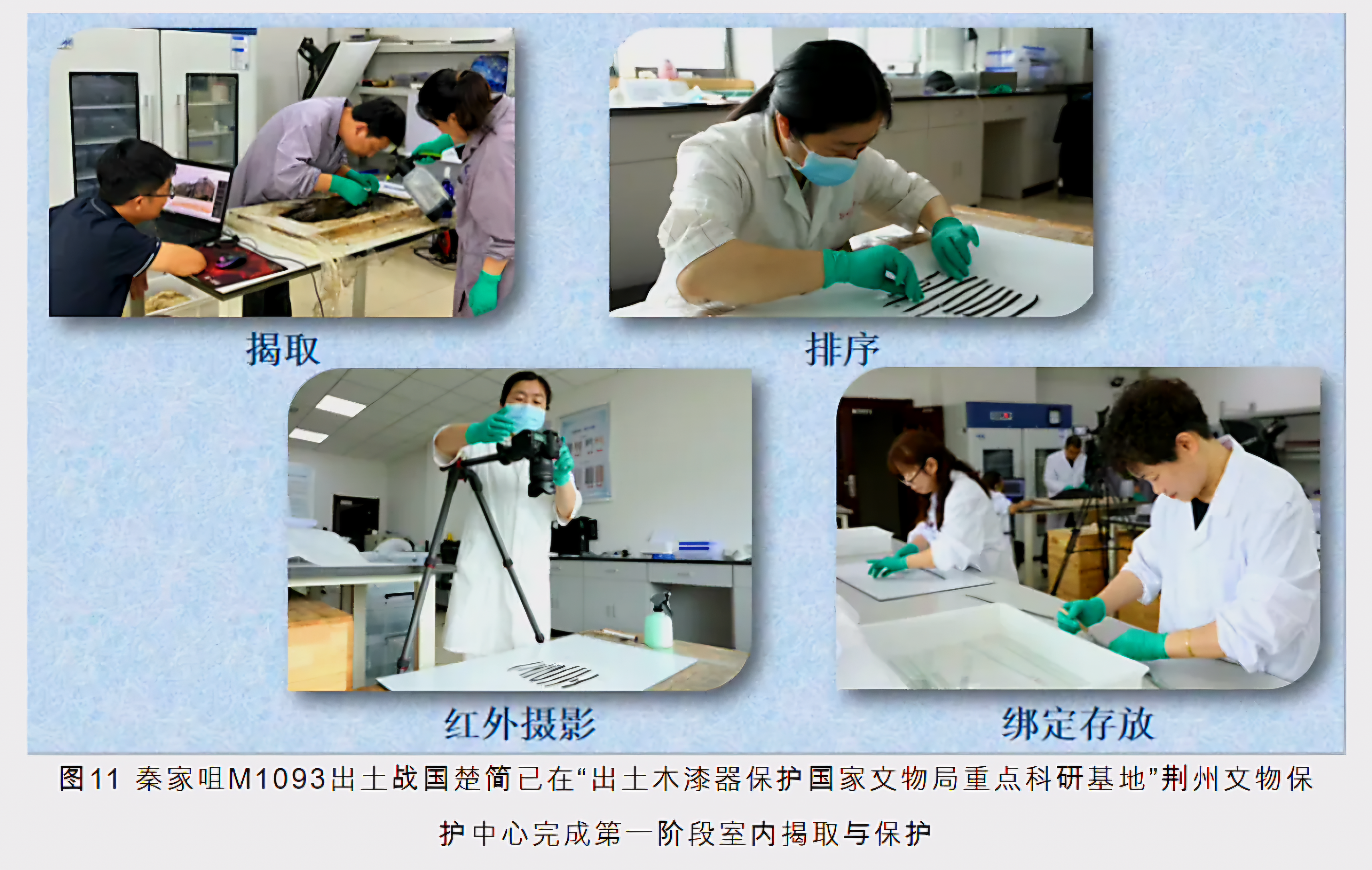 진가저秦家咀M1093 출토 전국 초간战国楚简은 이미 “출토 목칠기 보호 국가문물국 중점 과연기지出土木漆器保护国家文物局重点科研基地” 형주문물보호중심荆州文物保护中心에서 제1단계 실내 게취揭取와 보호를 완성했으니
