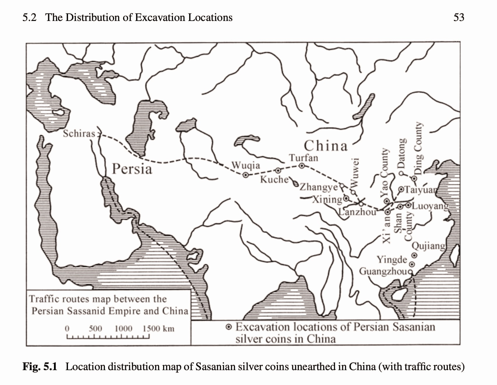 곧 중국에서 사산조 페르시아 은화이 출토된 지점들을 정리 표시한 것이다.