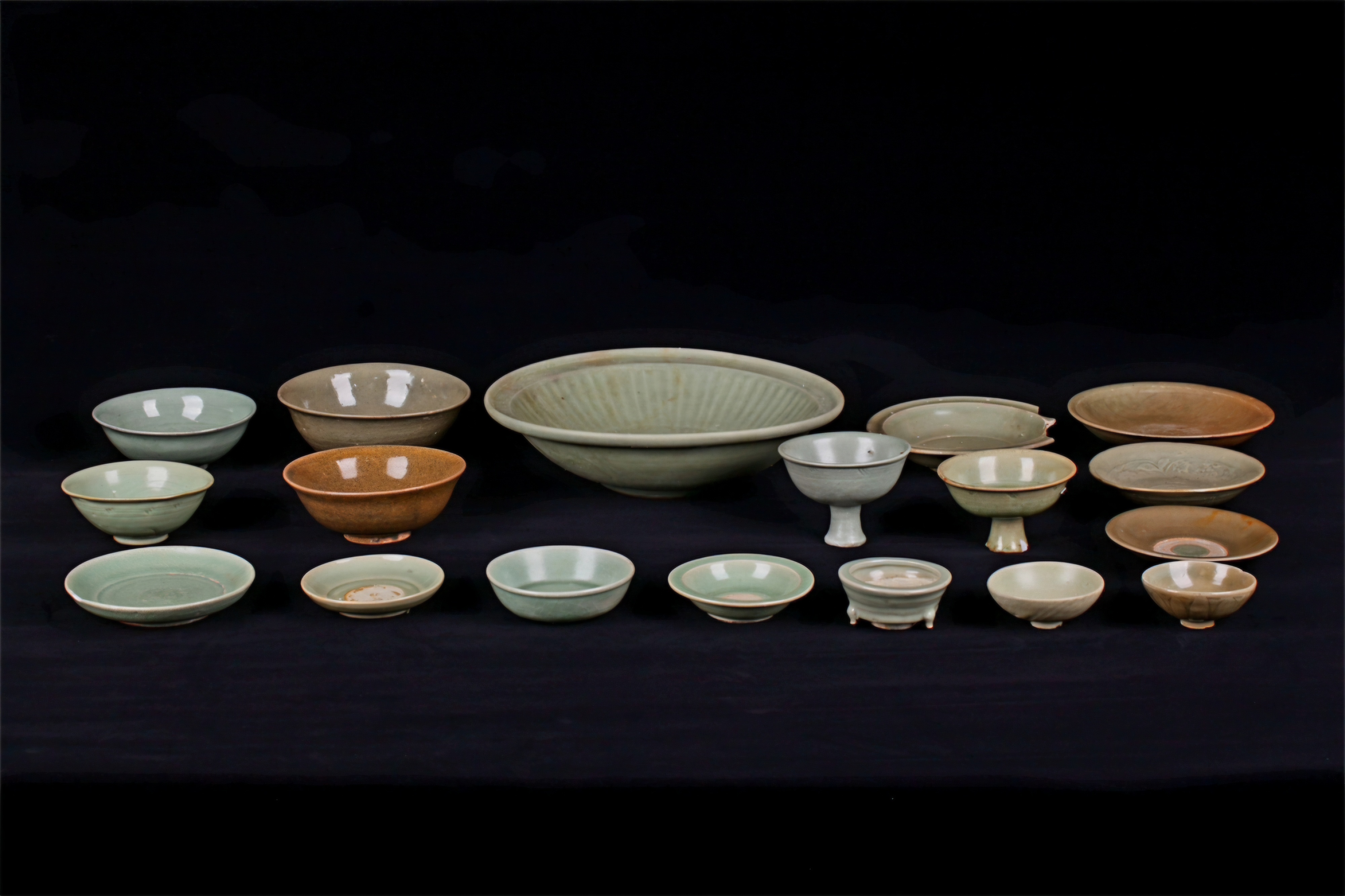 개중 용천청자 수량은 1만6천여 건에 달하며 그 기종으로는 완碗반盘·설碟·잔盏·세洗·발缽·향로香炉와 고족배高足杯 등을 포괄하며 제작 연대는 원대元代 만기晚期에 해당하며 전형적인 해외 수출용 자기다.