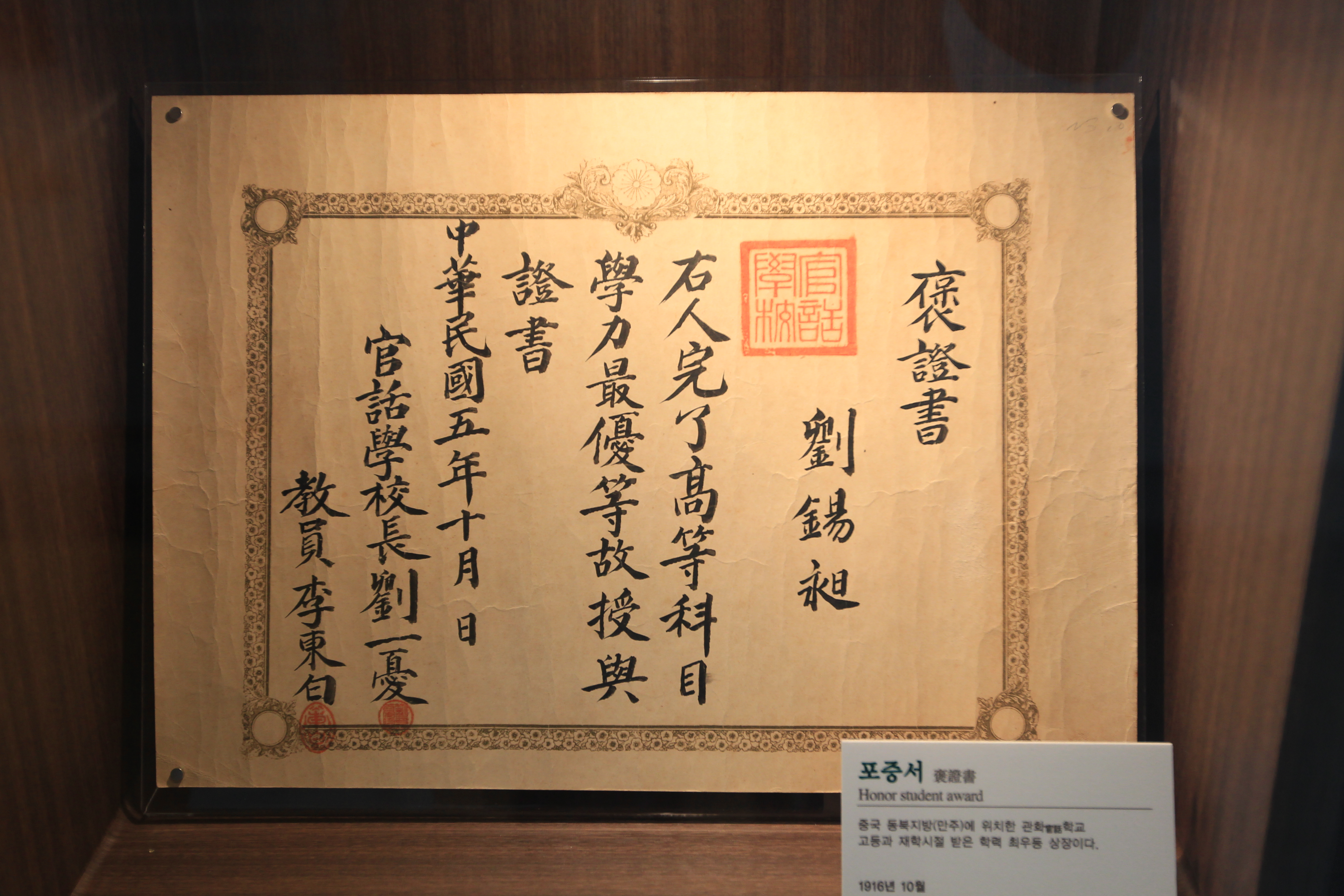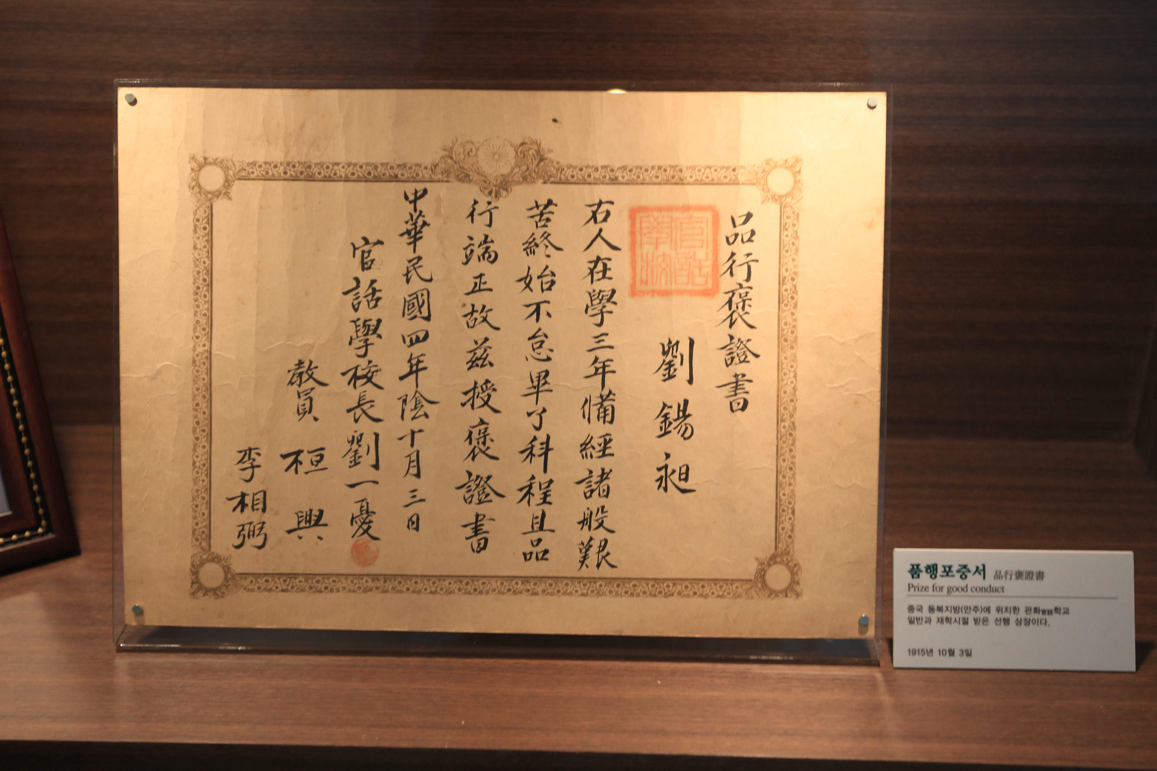중국 동북지방 만주에 위치한 관화官話학교 일반과 재학시절 받은 선행 상장이라 설명하며, 발행일은 1915년 10월 3일이라 한다.