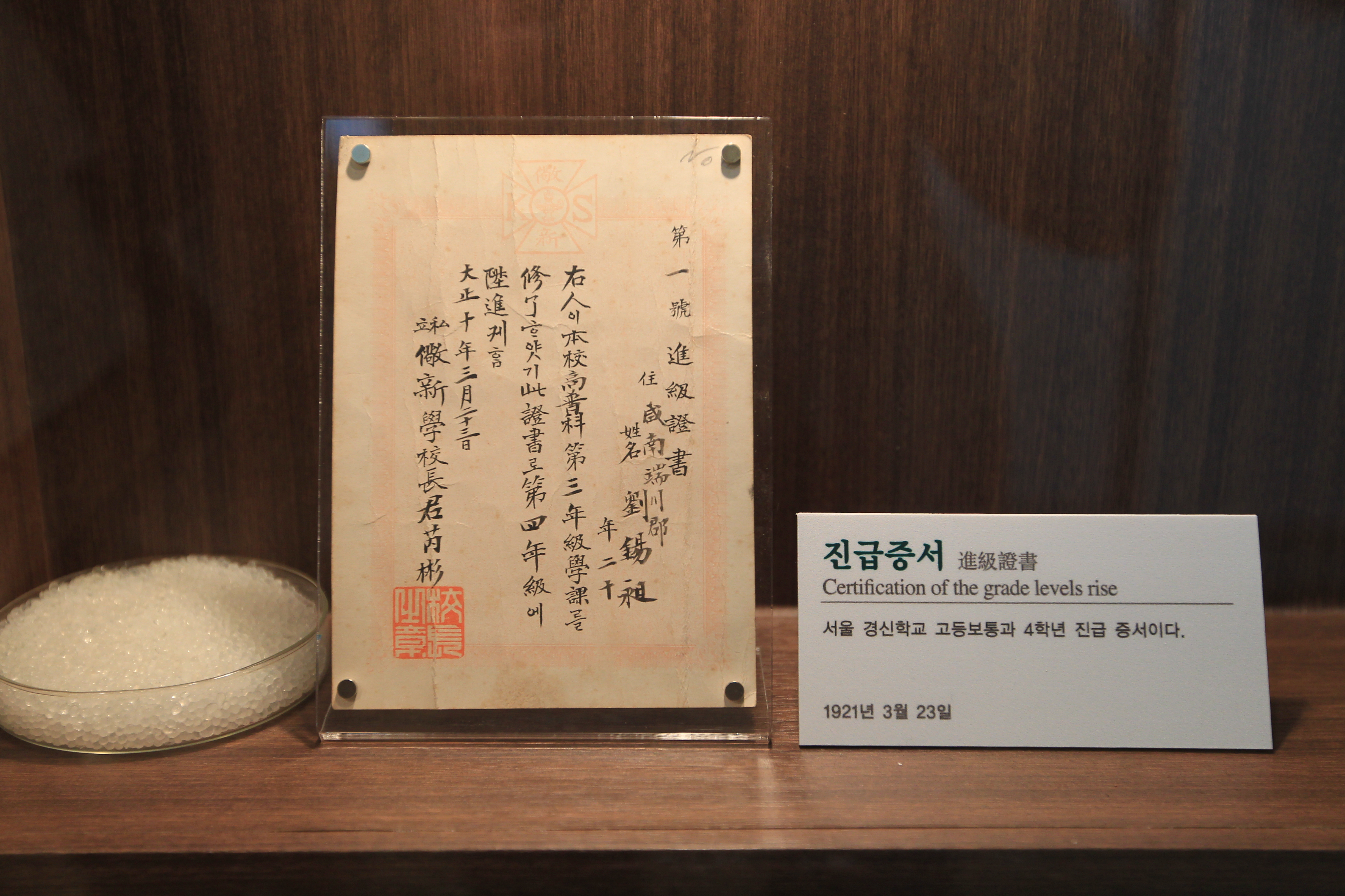 이건 제1급진급증서라, 유석창이 1921년 3월 23일 서울 경신학교 고등보통과 4학년 진급증서라 한다.