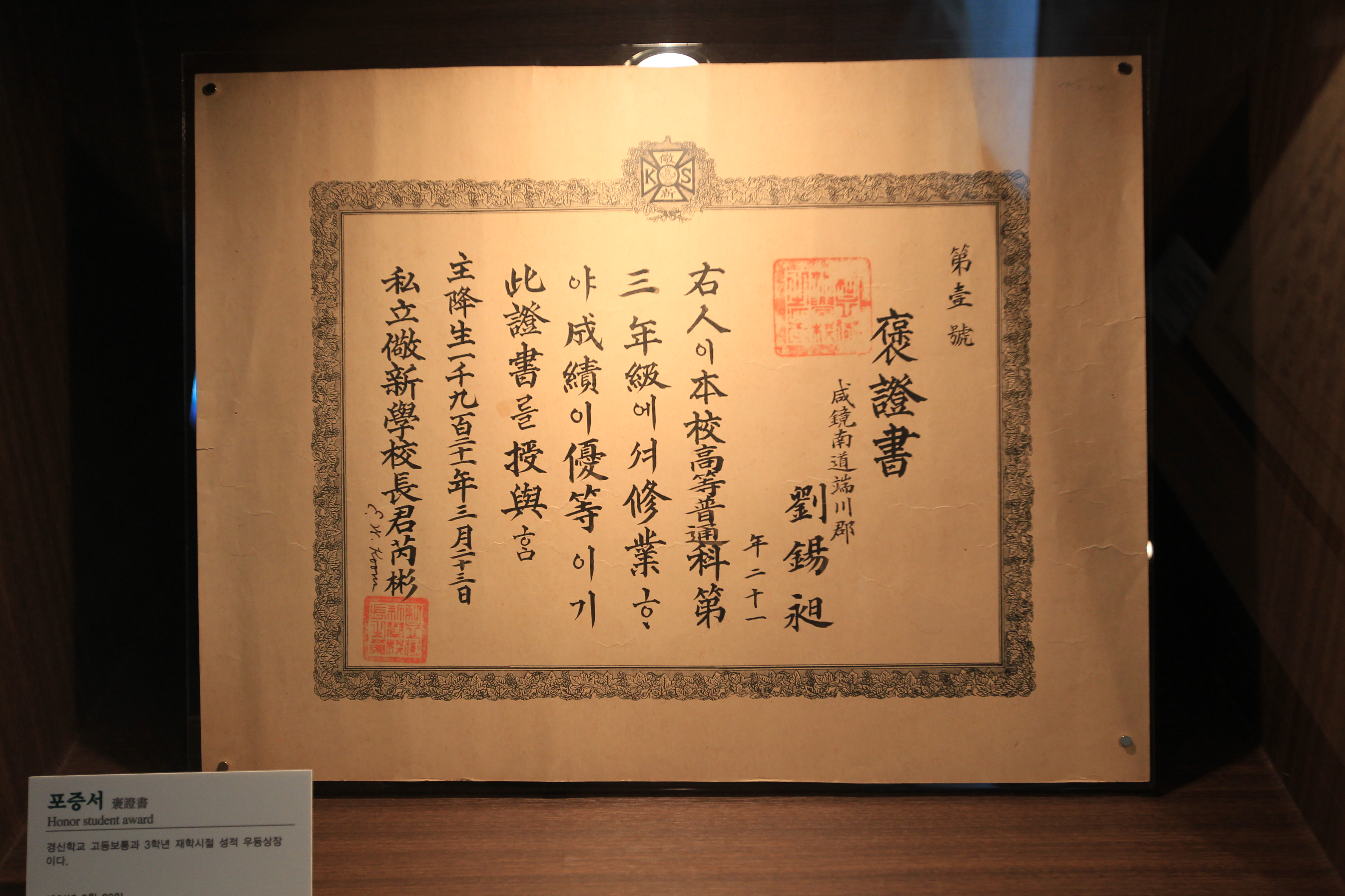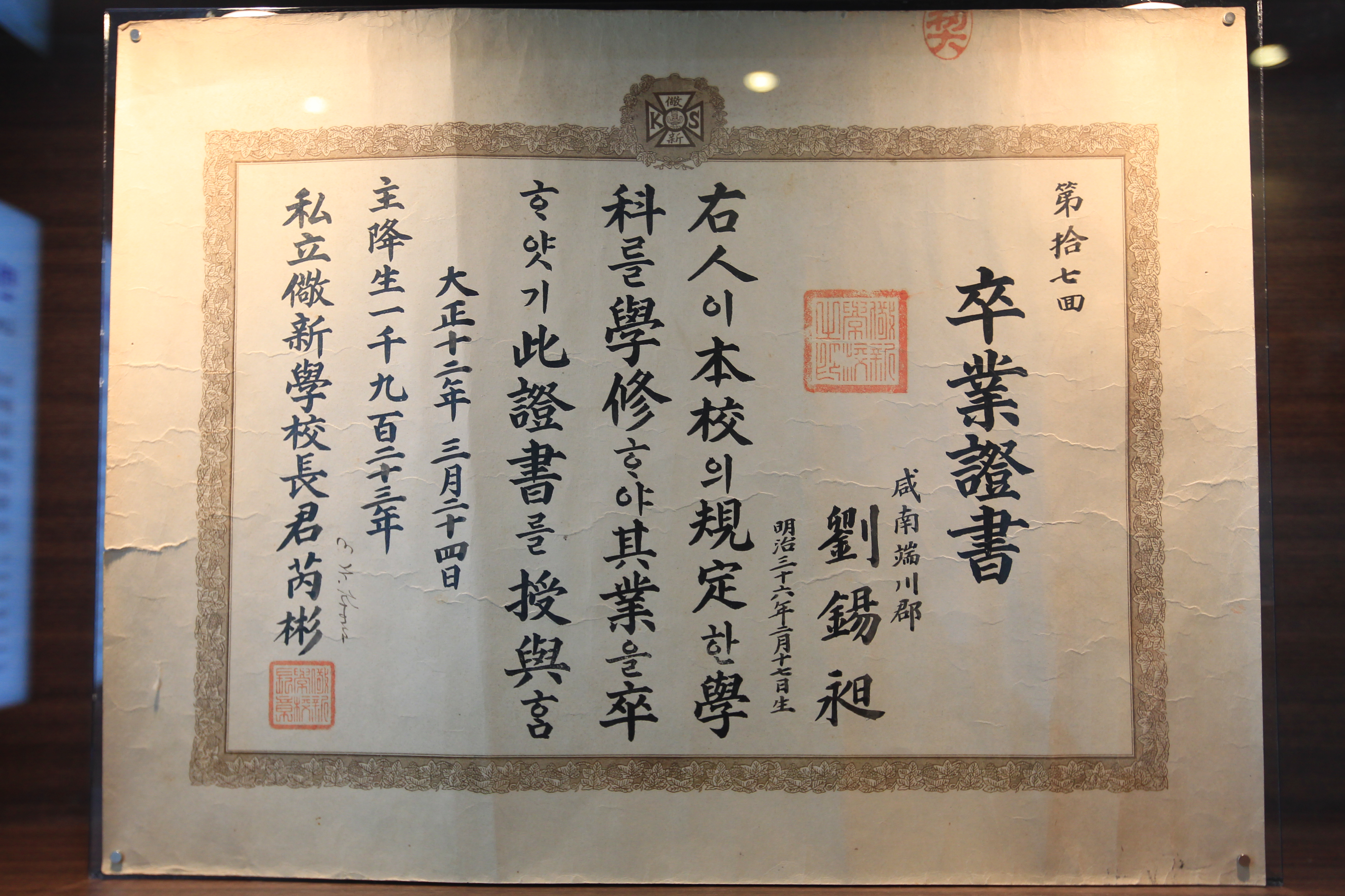 앞 사람은 재학 3년 제반 어려움을 겪으면서도 시종일관 게으름 피지 않고 과정을 마치고 또 품행이 단정하니 이런 까닭에 포증서를 준다. 중화민국 3년 음력 10월 3일 관화학교장 유일우劉一憂 교원 환흥桓興·이상필李相弼