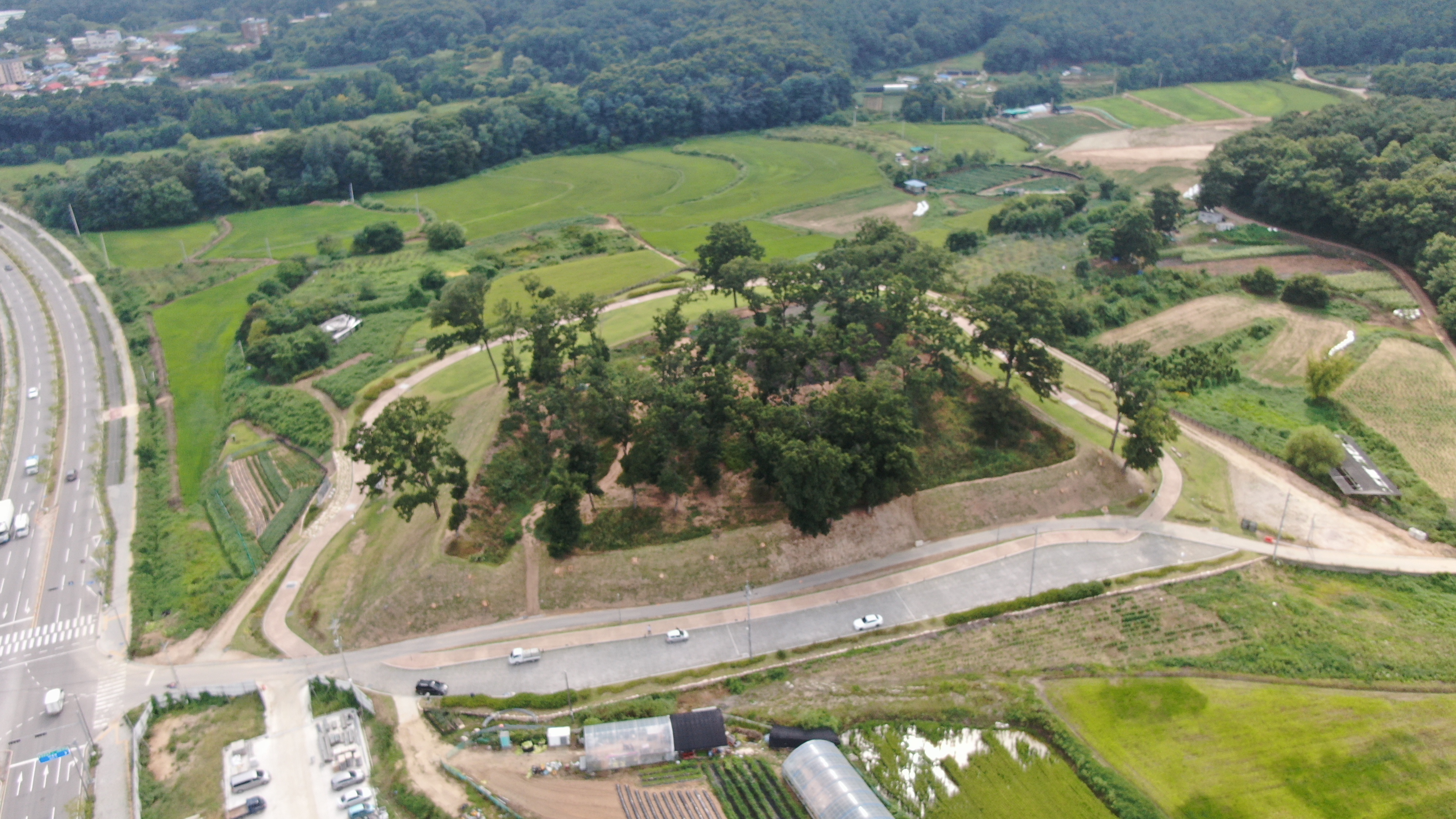 백만이 주는 압박감은 대단하나, 용인이 그렇게 집적한 고도 밀도 대도시 느낌을 상대적으로 덜 주는 이유가 이 때문이라고 본다. 처인성은 그런 용인에서도 아직은 인구밀도가 낮은 남부 지역 남사읍 아곡리에 위치한다. 상권 혹은 거주권이라는 측면에서 용인보다는 외려 서쪽으로 인접한 화성 동탄신도시에 가깝지 않은가 하는 느낌을 준다. 그 주변은 여전히 도시 풍모보다는 한적한 농촌에 가깝지만 특이한 대목도 있어 ‘e편한세상 용인 한숲시티(이하 한숲시티)’라 해서 대규모 아파트 신축단지가 북쪽 인접 지점에 들어서 있다는 점이 그것이다. 관련 자료를 찾아보니, 2015년 10월에 대림산업이 지하 2층, 지상 29층 67개 동, 6개 블록, 전용면적 44∼103㎡에 6천725가구 규모로 분양을 시작한 “신도시급 대단지”라 한다.