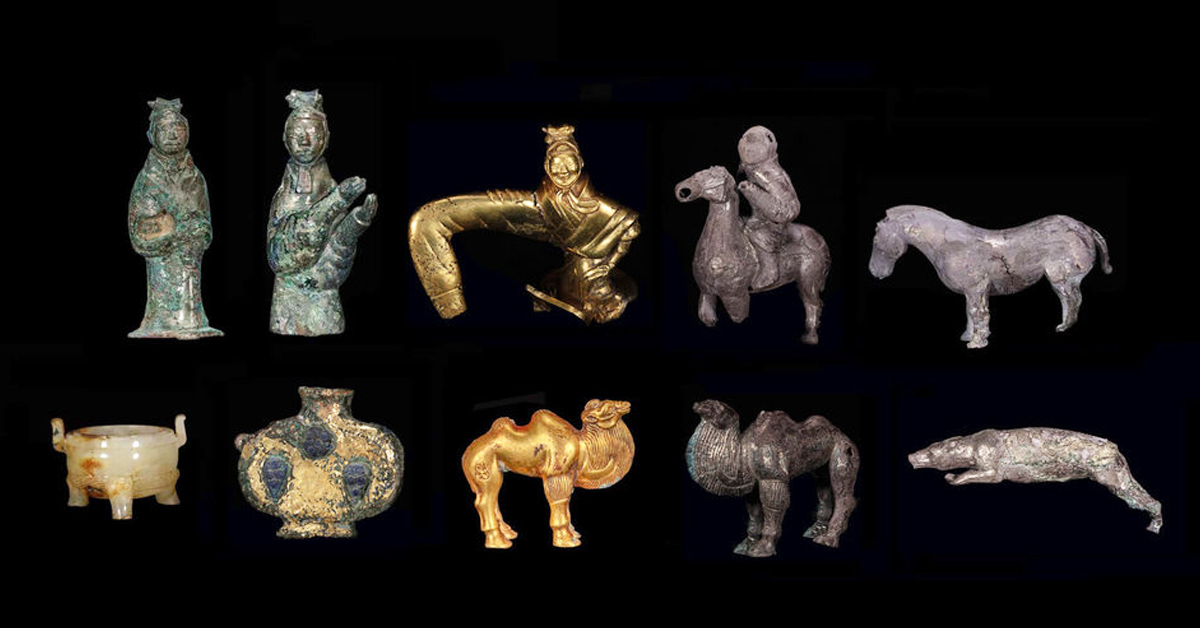 소형 명기로는 금은 낙타金银骆驼와 무수용舞袖俑, 취주용吹奏俑, 백희용百戏俑, 마용马俑, 기마용骑马俑, 렵견猎犬, 은합银盒 등이 있다.