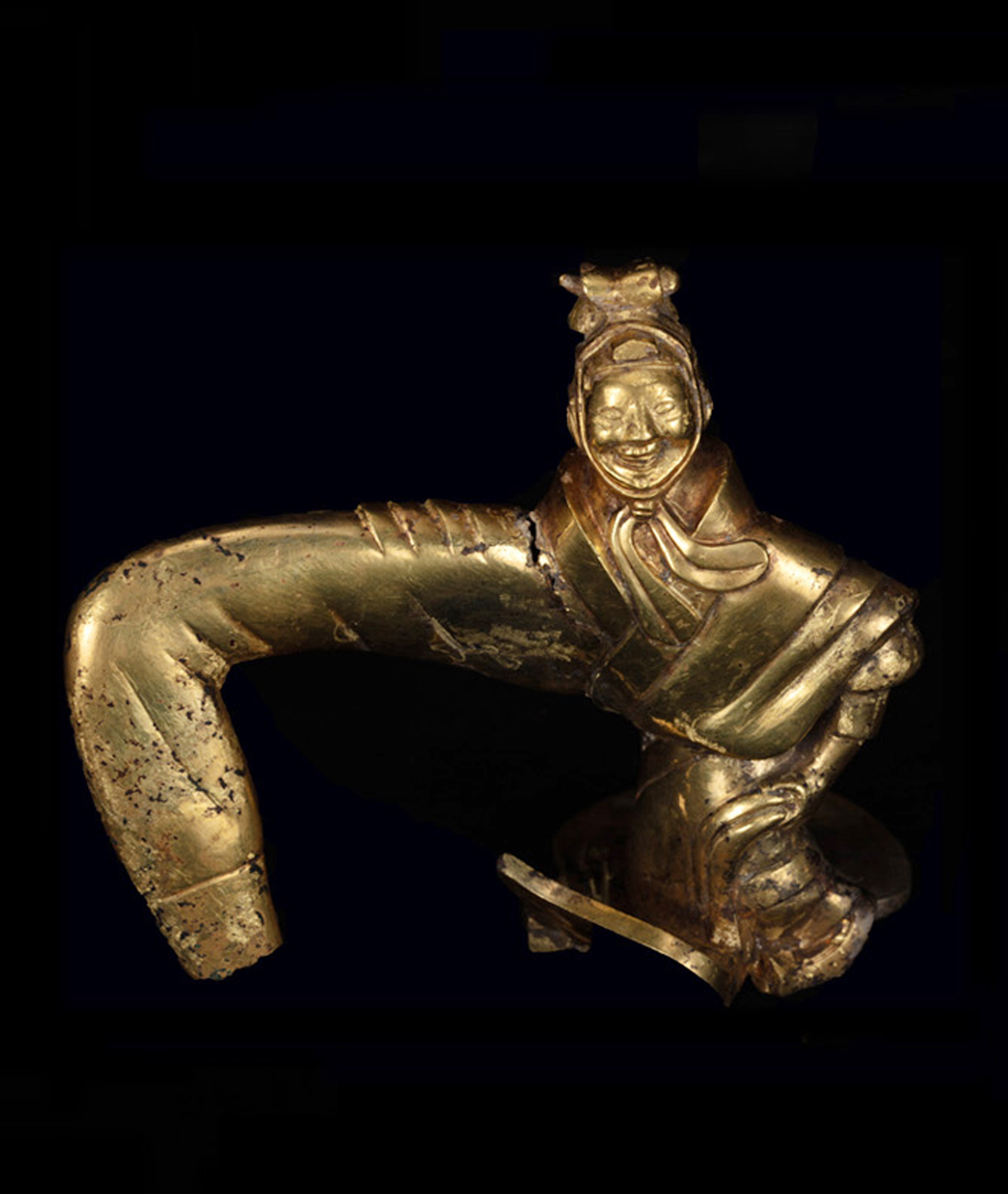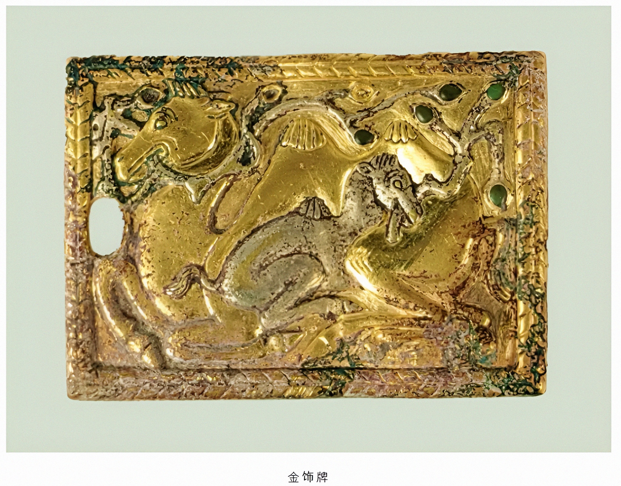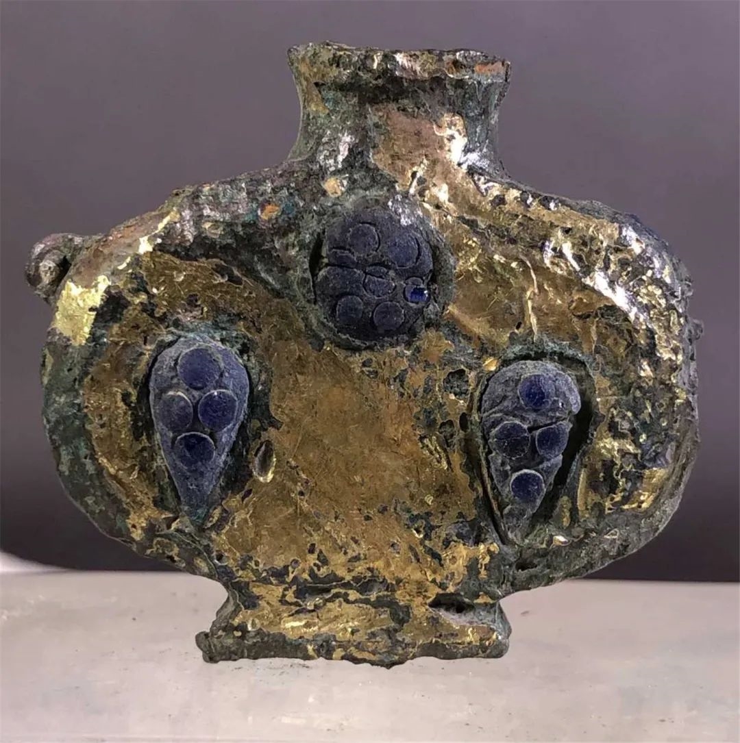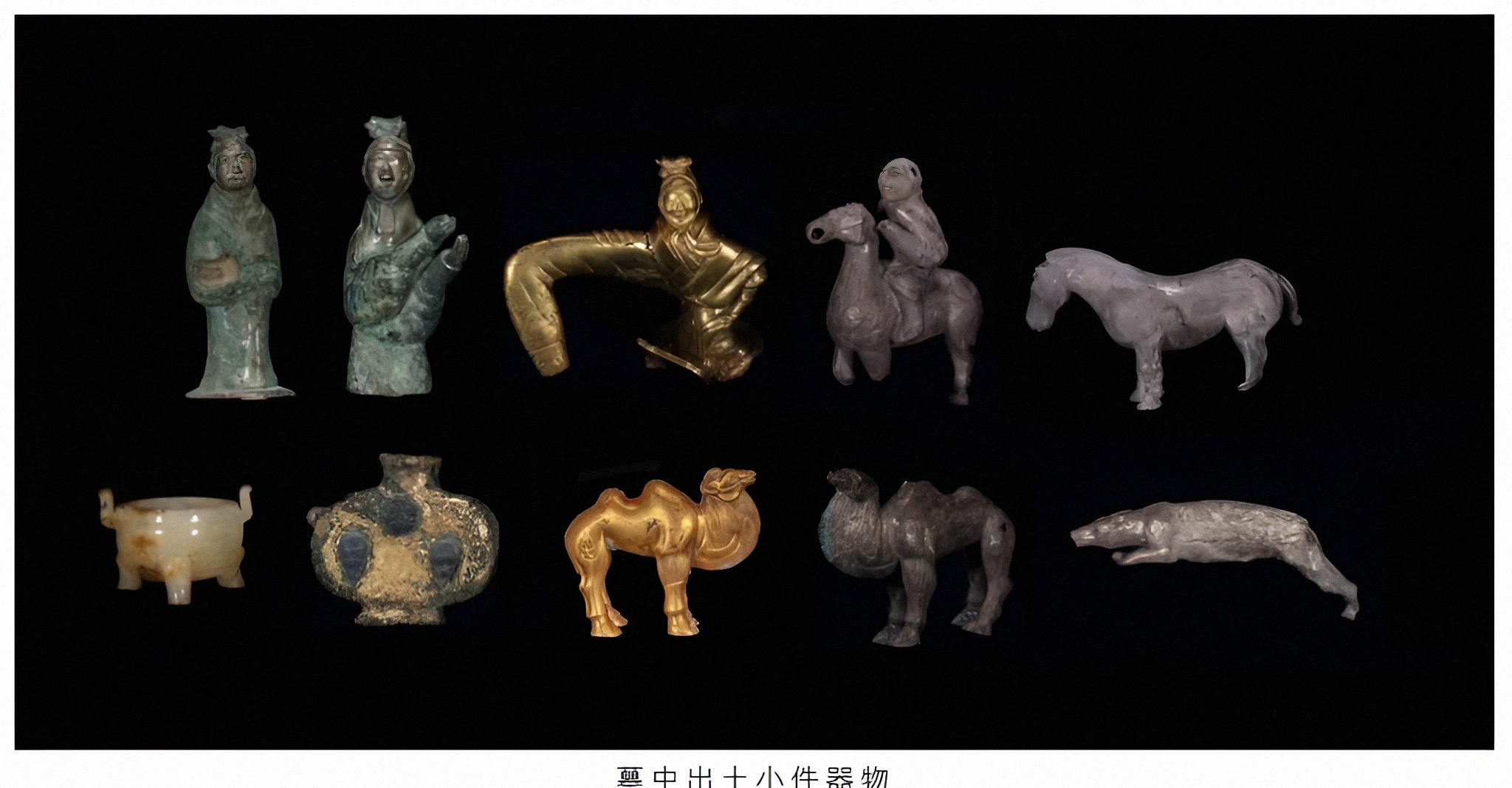 금식패金饰牌、금대구金带钩는중원지구中原地区와 주변 문화가 교류융합했음을 실증한다. 금은 낙타骆驼가 대표하는 금속제 용俑은 가장 큰 특징이라 이는 진대秦代 예술 걸작품일 뿐만 아니라 동서문화교류의 실증이다.