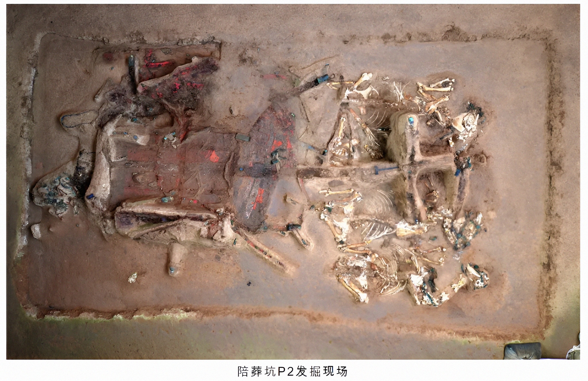 P2 거마车马는 보존 상태가 기본적으로는 완정하며 马勒佩戴齐备와 기타 마륵马勒、개궁모盖弓帽、辖軎、弩辄、각주식角柱饰 등 거마기车马器와 채회彩绘 흔적이 있다.