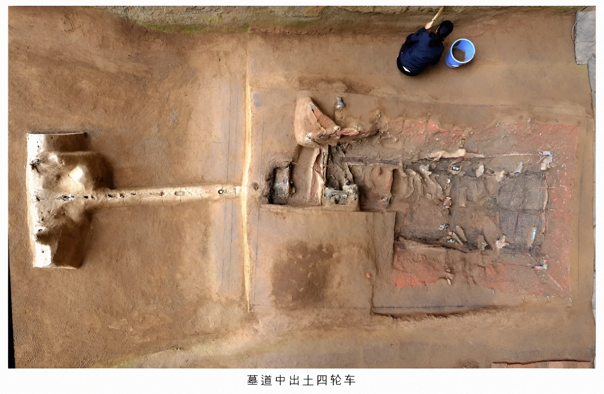 청리清理 중에 1량4륜辆四轮 독주목거独辀木车가 비교적 온전한 상태로 발견됐다.