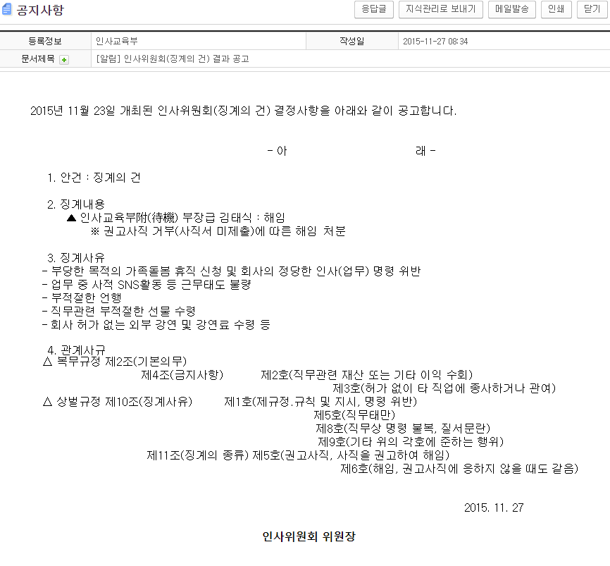 해고라든가 정직 같은 징계를 성립케 하는 세 축이 있다.