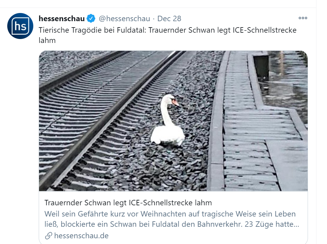 어찌한 이유로 하필 크리스마스 이브에 짝을 잃은 백조가 그 죽은 짝을 넋놓고 철버덕 주저 앉은 데가 기차선로라 어찌하여 저걸 발견했는지는 모르나 저 친구가 비켜주길 기다리는 바람에 Kassel과 Göttingen을 연결하는 고속철 23대가 대략 오십분간 연착했단다.