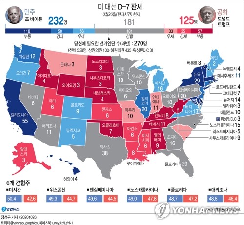 코앞에 다가선 미국 대통령선거 판세를 표시한 우리 공장 그래픽. 미 대선은 직접선거와 간접선거를 교묘히 결합한 형식이라, 이게 근자에는 문제가 되기 시작해서, 전체 득표에서는 앞선 후보가 패배하는 일이 연이어 생겼으니, 부시 2세한테 석패한 앨 고어가 그랬고, 저번 트럼프한테 분패한 힐러리 클린턴도 마찬가지였다.