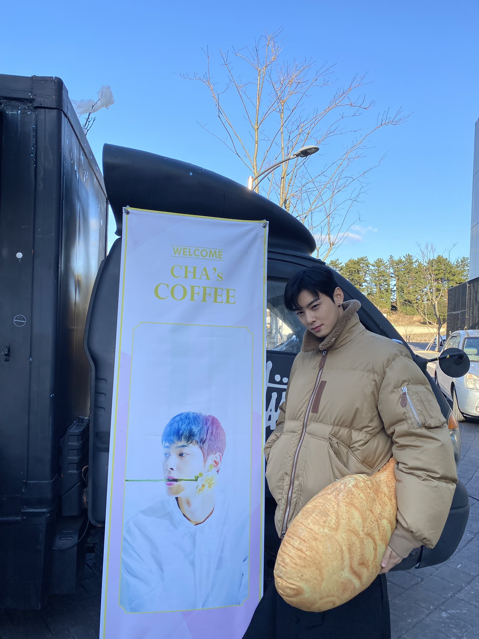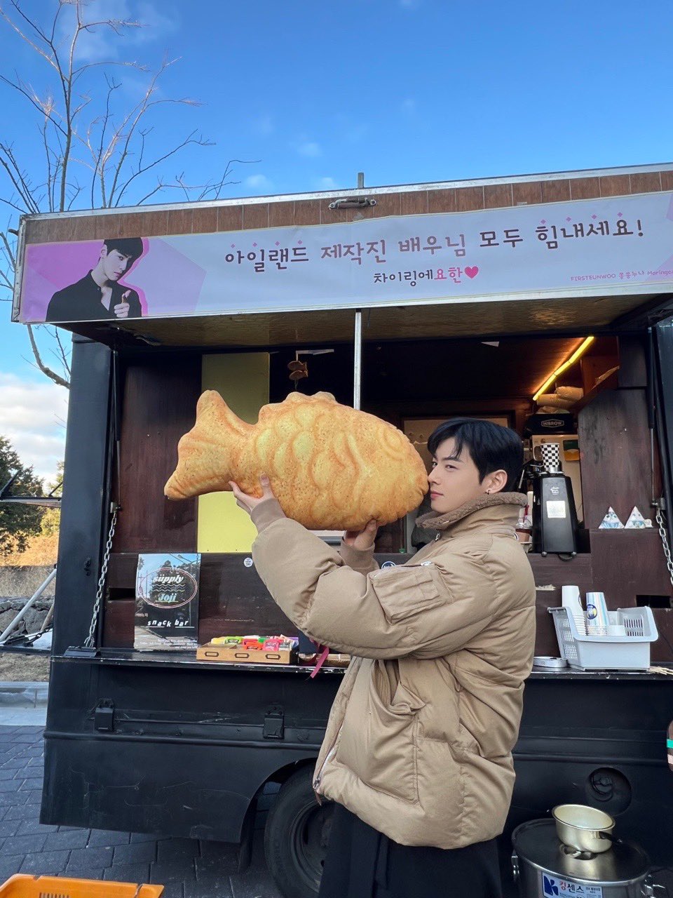 이야기인즉슨 아일랜드라는 새 드라마에 아스트로 대표간판 차은우가 나오는데 아스트로 팬클럽이 한 5일전쯤에 촬영장에 스태프랑 출연진 먹으라고 붕어빵 간식차를 보냈고, 그걸 차은우가 잘먹었다는 인증샷을 그네들 트위터 계정에 올린 것이란다.