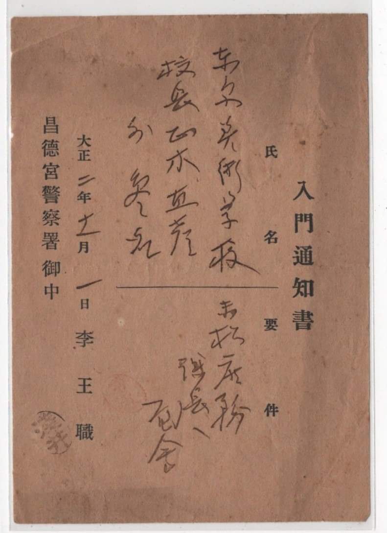 용건 부분 글자는 잘 모르겠는데(무슨 서무庶務가 어쩌고....인 듯 하다) 이왕직李王職에서는 옛 대한제국 황족들이 사는 궁궐을 '지키기' 위해 설치한 창덕궁경찰서에 이 사람들이 궁궐 문을 들어온다는 사실을 알리는 '입문통지서入門通知書'를 끊어주었다.