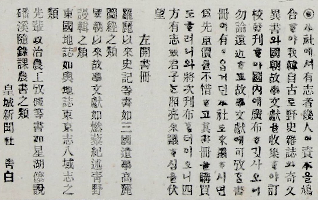 ⊙本社에셔 有志者 幾人이 資本을 鳩合하야 我韓自古로 野史雜誌와 奇文異書와 國朝故事文獻을 收集하야 訂校發刊하야 國內에 廣布하겠사오니 勿論遠近하고 故事文獻에 可攷할 書冊이 有압거던 本社로 來議하시면 爲先重價를 不惜하고 其書冊을 購買도 하려니와 將次 刊布할 터이오니 四方有志僉君子는 照亮來議하심을 伏望